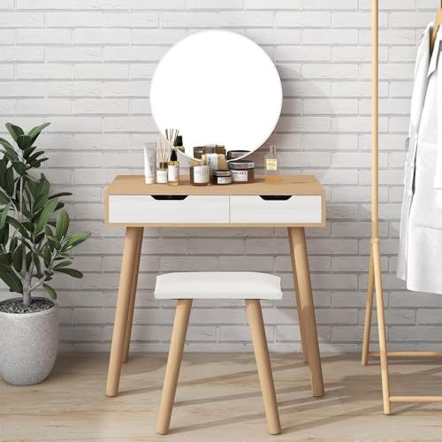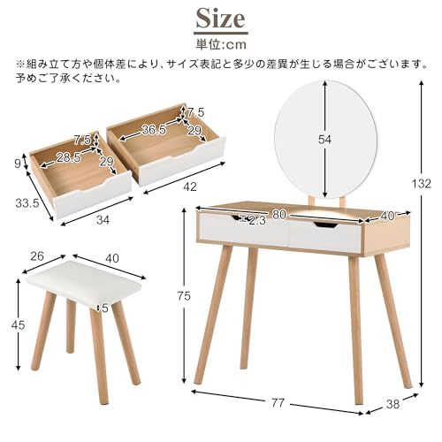 BTM ドレッサー コンパクト 2点セット 化粧台 鏡台 引出2杯 大きめの鏡54cm ドレッサーテーブル スツール付き 鏡台 女優ミラー 姫系 可愛い 収納 引き出し 収納 メイク台 シンプル 大容量 幅80cm ナチュラルe