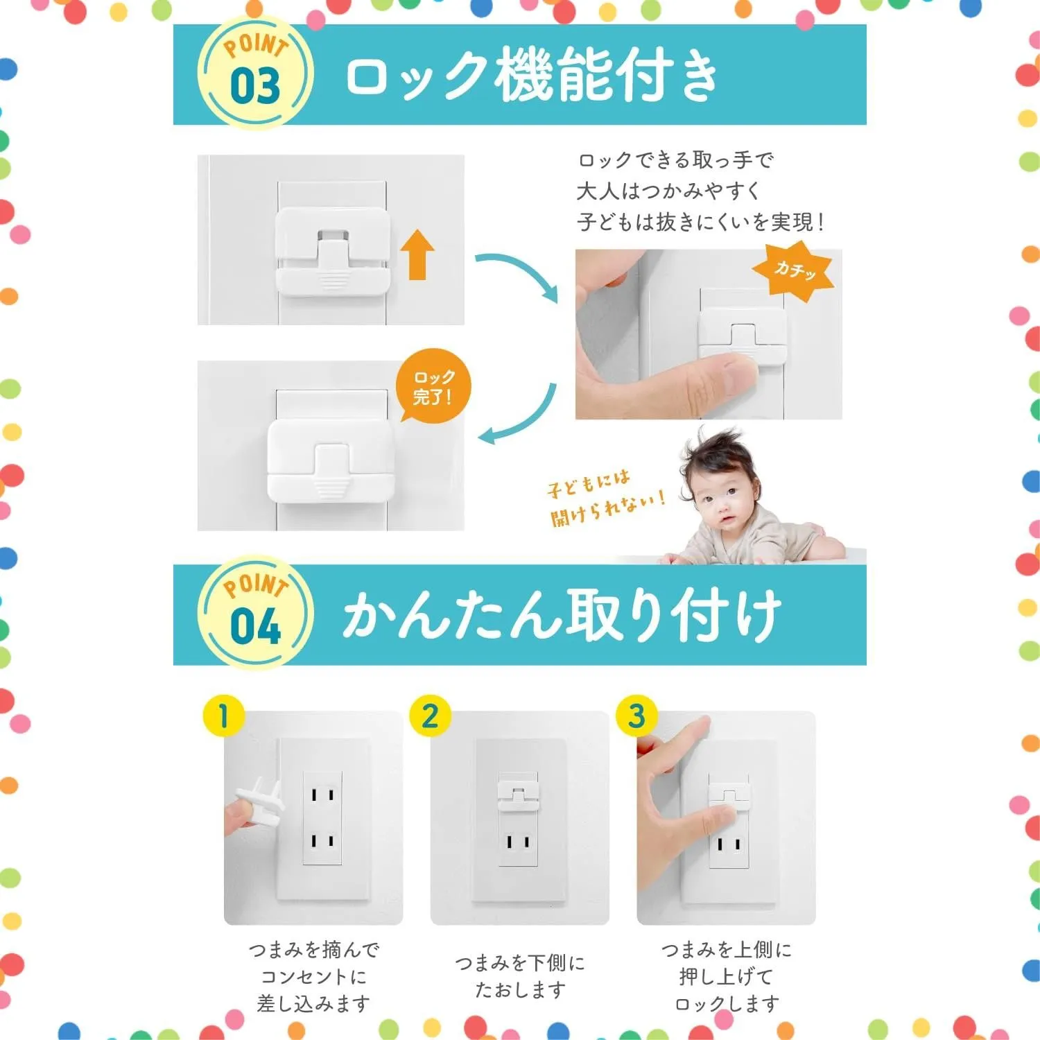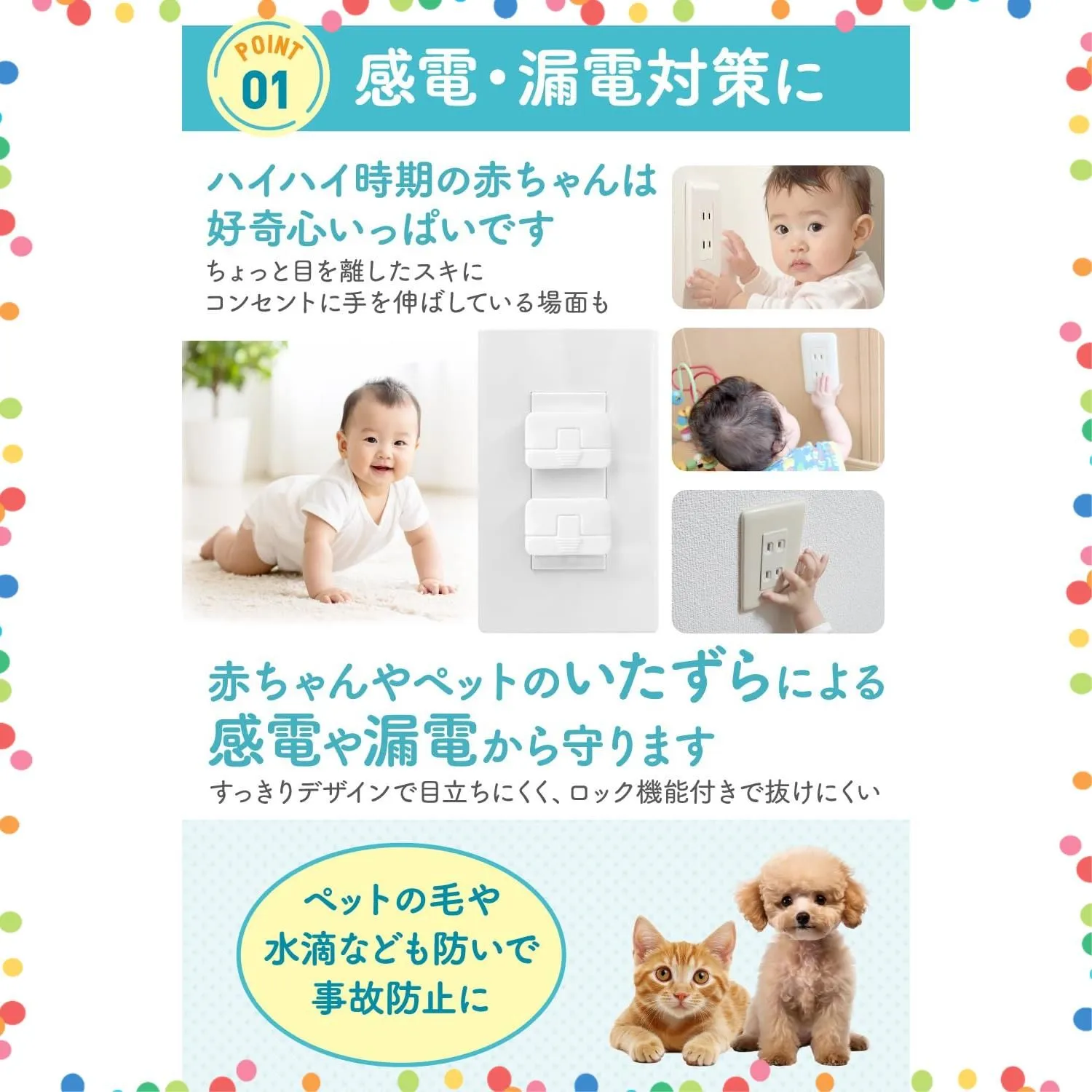 【赤ちゃんやペットの感電・漏電対策に】ハイハイ時期の赤ちゃんは好奇心いっぱいです!LAXELDコンセントカバーは、赤ちゃんやペットのいたずらによる感電や漏電から守ります。
