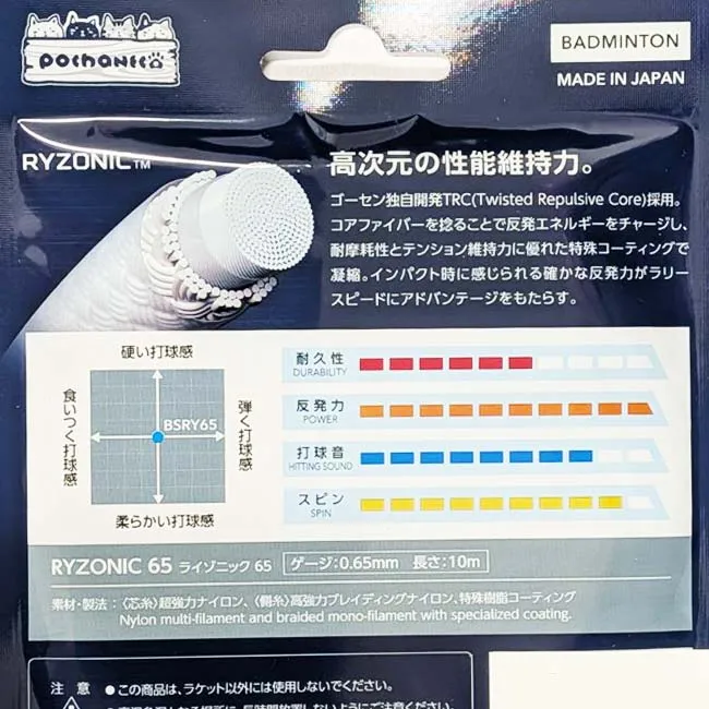 【単張パッケージ品】ゴーセン(Gosen) RYZONIC65 ライゾニック65 0.65mm ぽちゃ猫 バドミントンガット 国内正規品 BSRY65P(25y12m)(520149993)