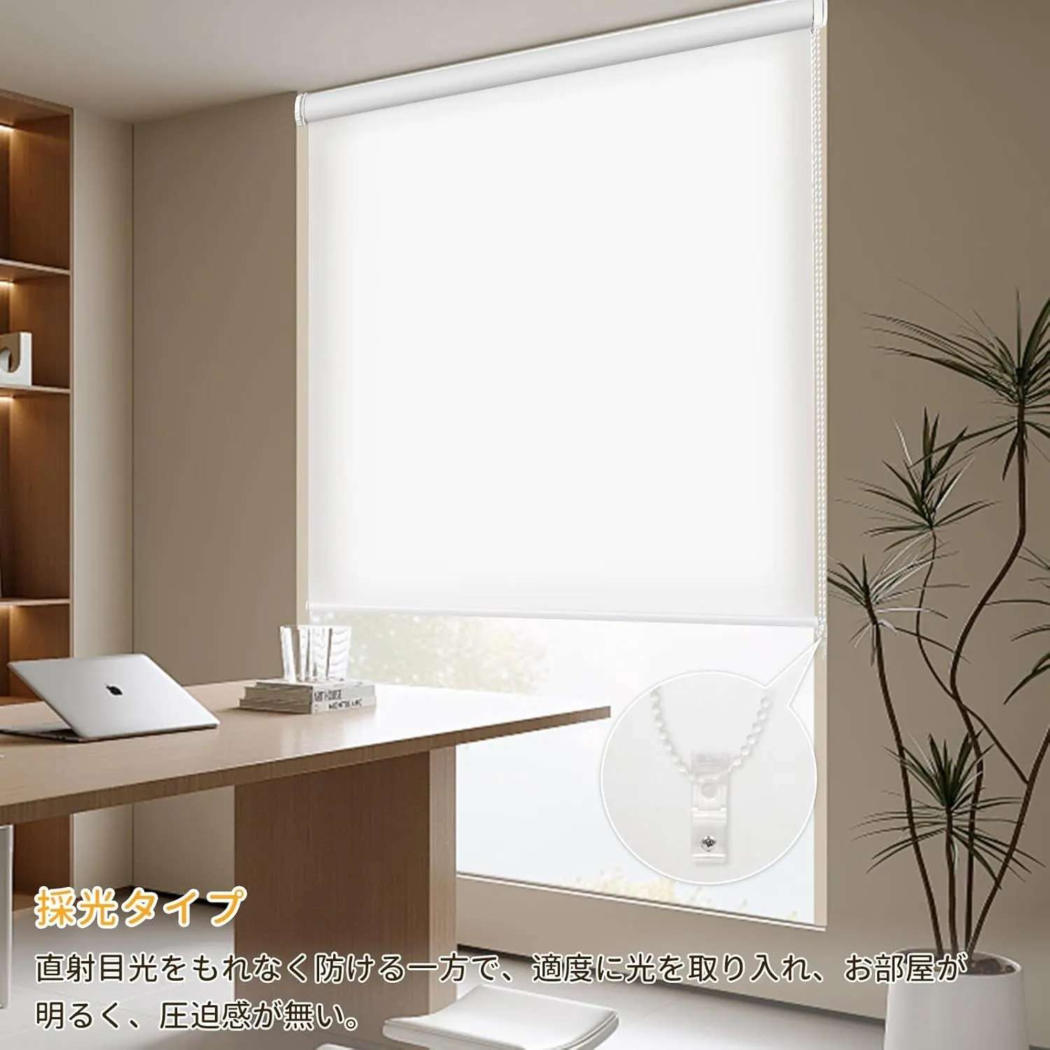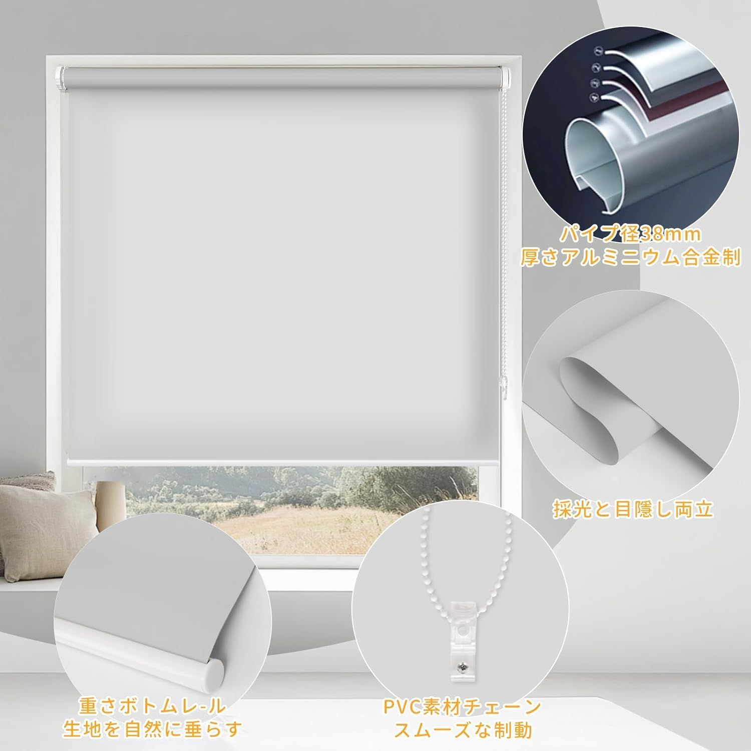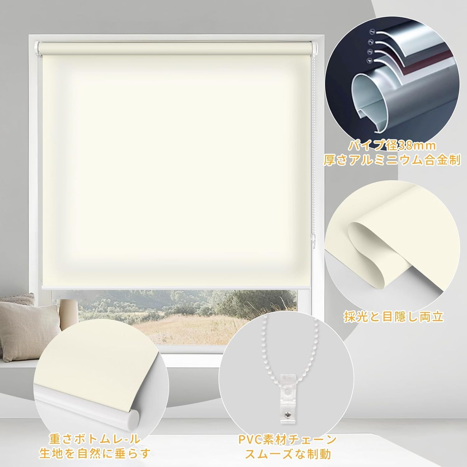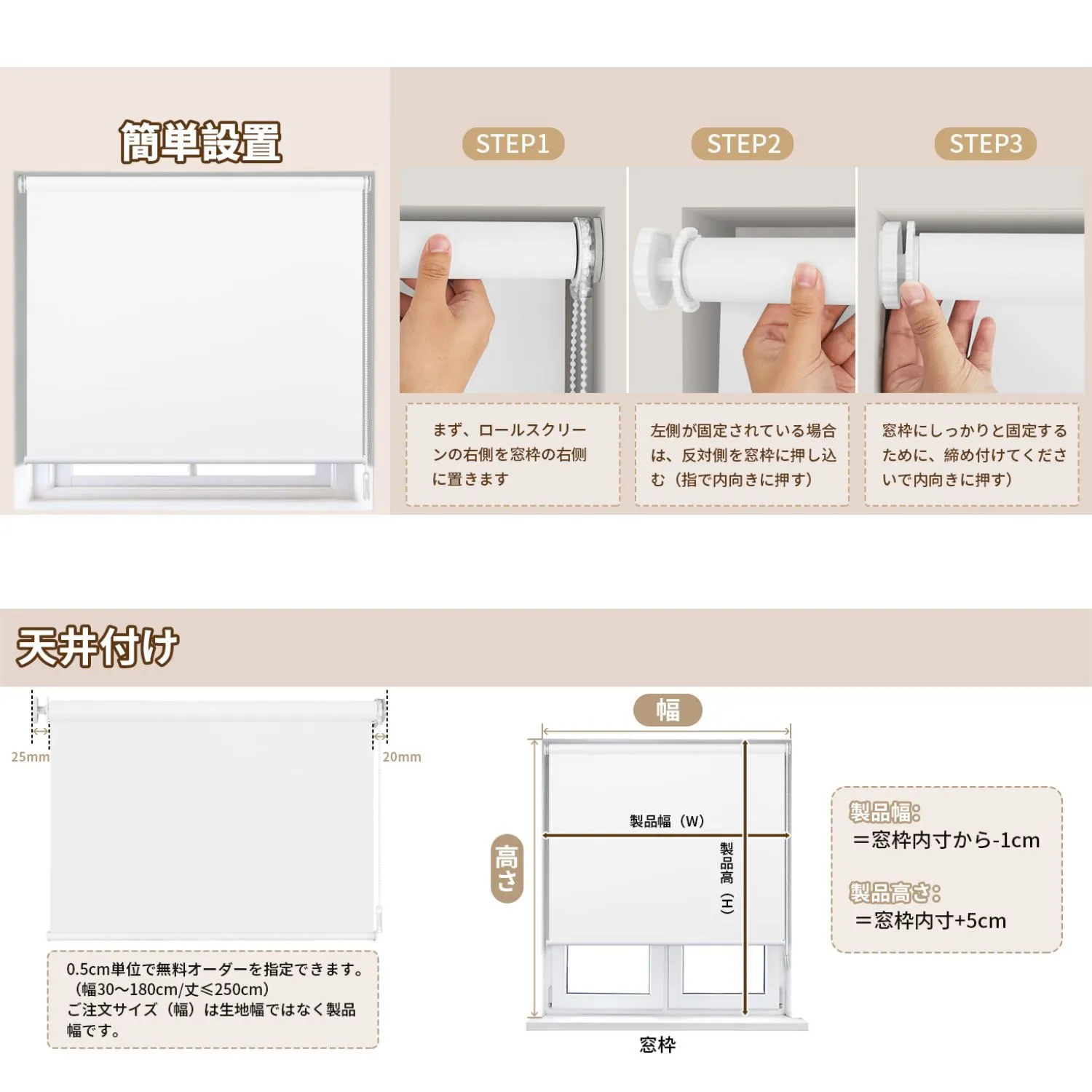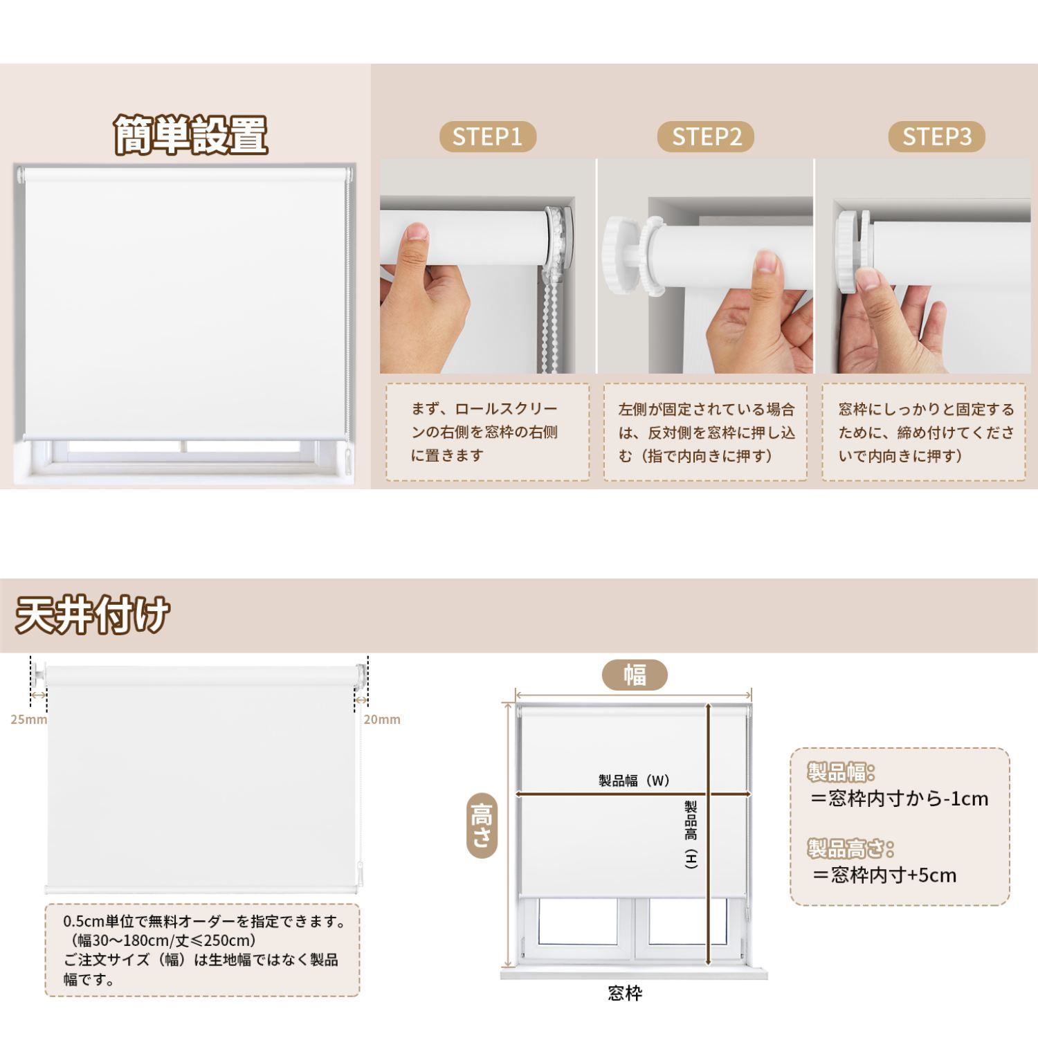 【賃貸OK】ロールスクリーン つっぱり 穴あけ不要 ネジ不要 1cm単位サイズオーダー可 遮光 採光 断熱 遮熱 UVカット 遮像 プライバシー保護 チェーン式 無地 ブラインド 押し入れ 目隠し 間仕切り キッチン 窓 3色対応