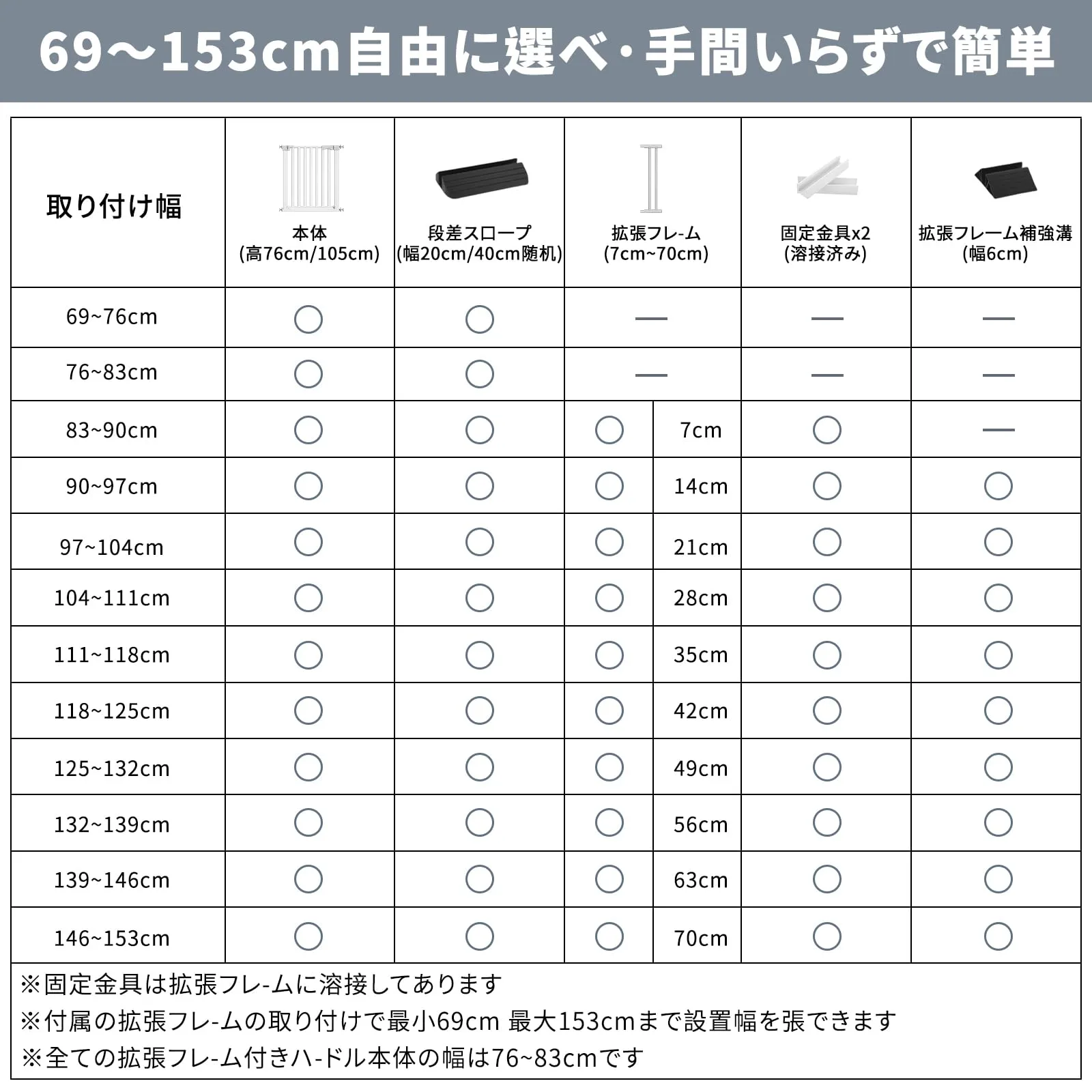 【幅調整自由&全配件付属:69-153cm柔軟対応】拡張フレーム(7-70cm) 付属で階段上・キッチン入口など幅153cmまで対応。「段差スロープ」「補強溝(90cm以上付き)」「溶接固定金具(溶接は延長)」を全付属!壁傷防止パッド(別売)やY型ボルト(別売)で柱状階段も設置可。