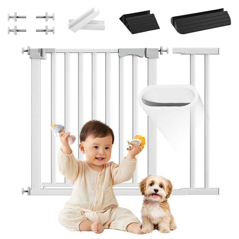 【2025新改良】 ベビーゲート 突っ張り式 ペットゲート ハイタイプ 幅69~153cm 高76cm 幅広 置くだけ 厚くスチールゲートドア付き 階段 玄関 台所 犬猫脱走防止 安心安全ダプルロック機能 前後90°自動開閉 防蹴パッド付き イノベーション2cm楕円管 色: 定番の白_サイズ: 幅90~97cm 高さ76cm