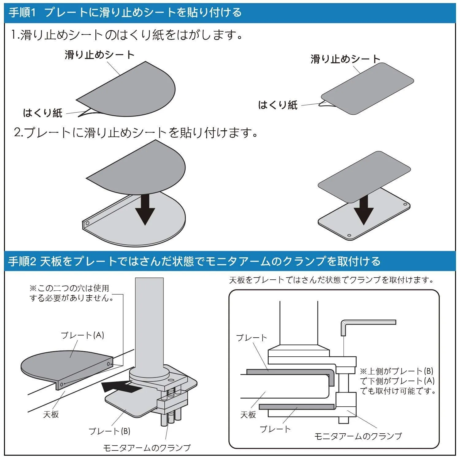 【選べる取り付け方】大小2つのプレートはどちらを上側にしても使えます。モニターアームのクランプ下側の設置面が少ない場合には、プレート(大)を天板下にして、接地面積を大きくできます。