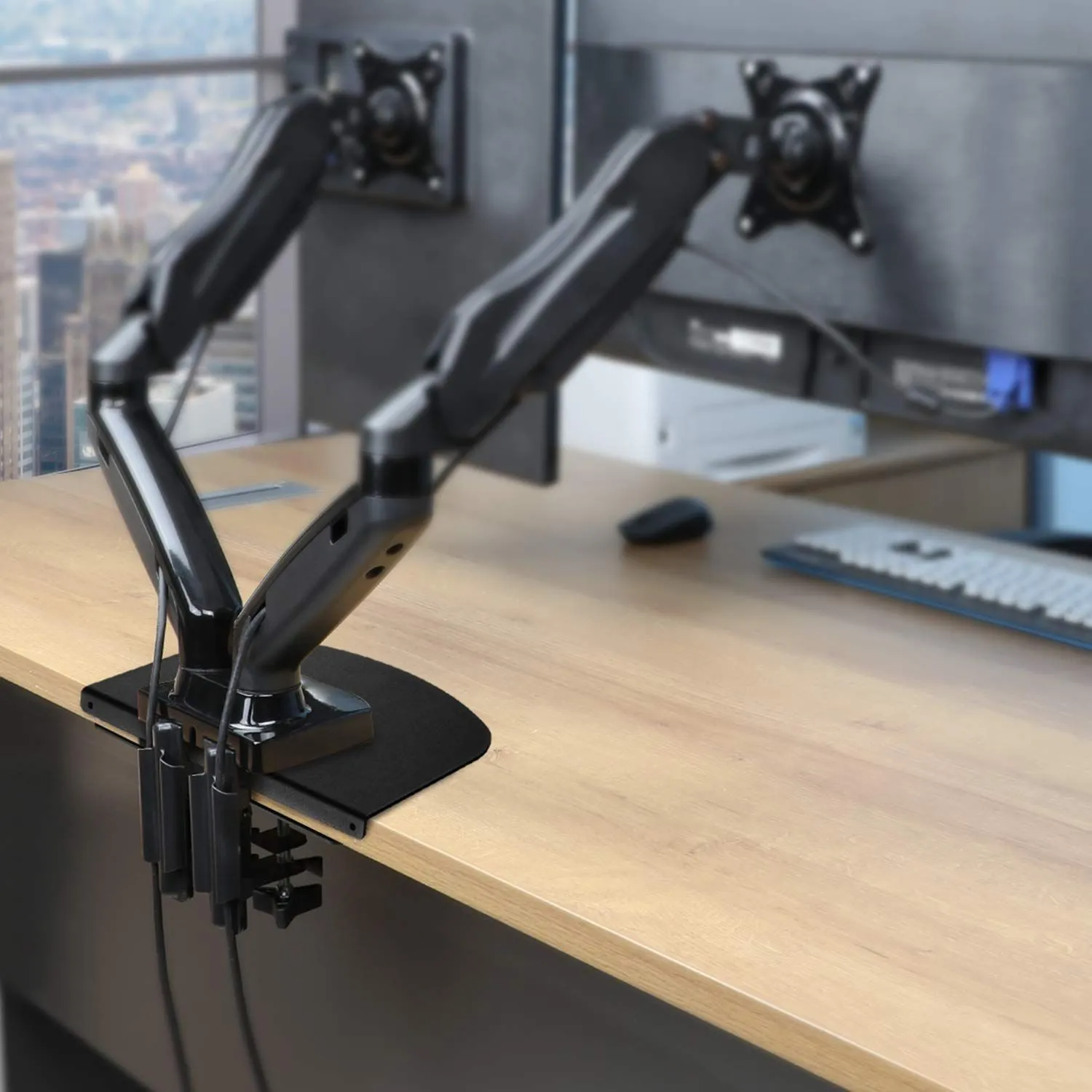 【より安定に】他社より広く設計されたプレートはシングルモニターアームだけではなく、デュアルモニターアームや大型モニターアームなど設置面が大きめのアームも対応しております。厚さ2.5mmの頑丈な鉄製のプレートでデスクを補強し、モニターアームを取り付ける時のゆがみやたわみを軽減し、デスクにしっかり取り付けることができます。