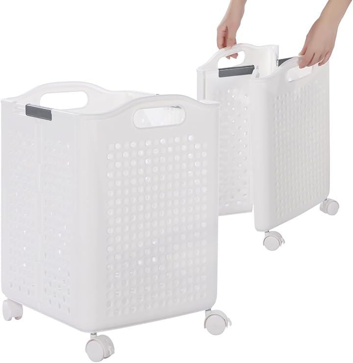 AZNABLE 折りたたみ10cmスリムx大容量 ランドリーバスケット 洗濯かご 洗濯物入れ キャスター付き PP素材 丈夫 丸洗い可 (ホワイト, Mサイズ)