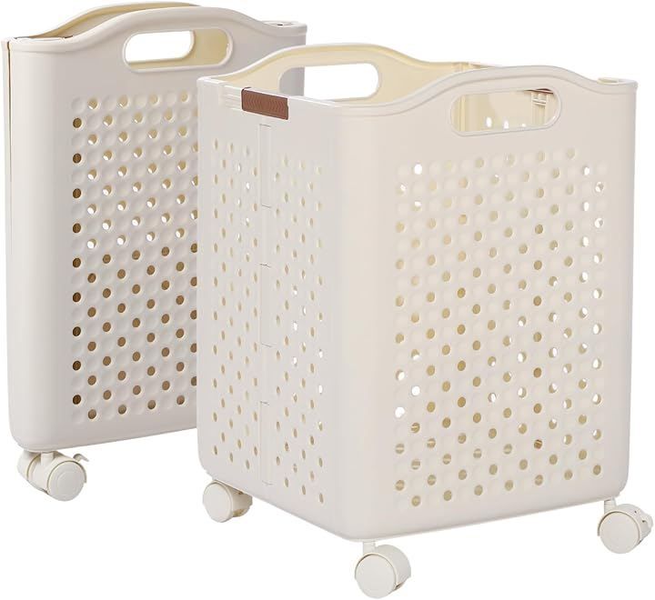AZNABLE 折りたたみ10cmスリムx大容量 ランドリーバスケット 洗濯かご 洗濯物入れ キャスター付き PP素材 丈夫 丸洗い可 (アイボリー, Lサイズ)
