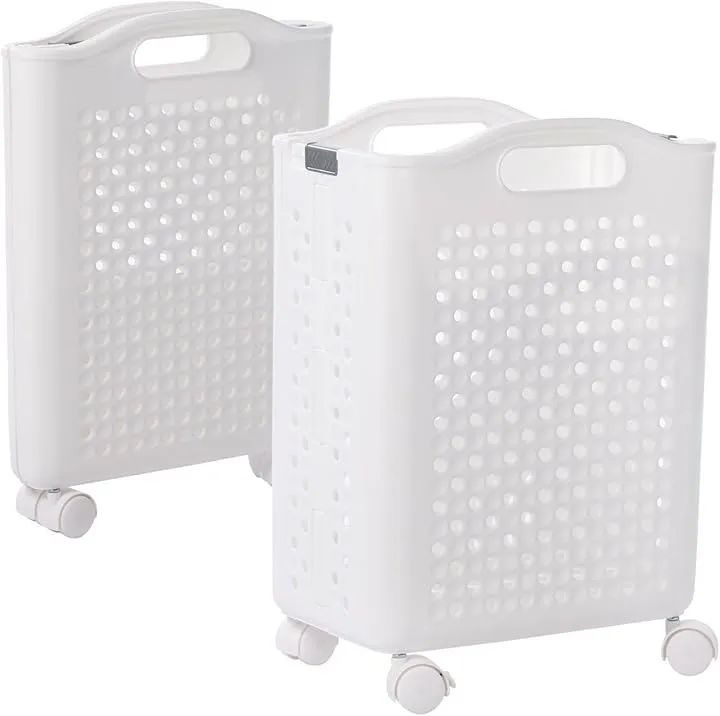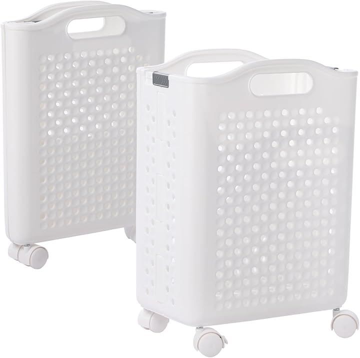 AZNABLE 折りたたみ10cmスリムx大容量 ランドリーバスケット 洗濯かご 洗濯物入れ キャスター付き PP素材 丈夫 丸洗い可 (ホワイト, Sサイズ)