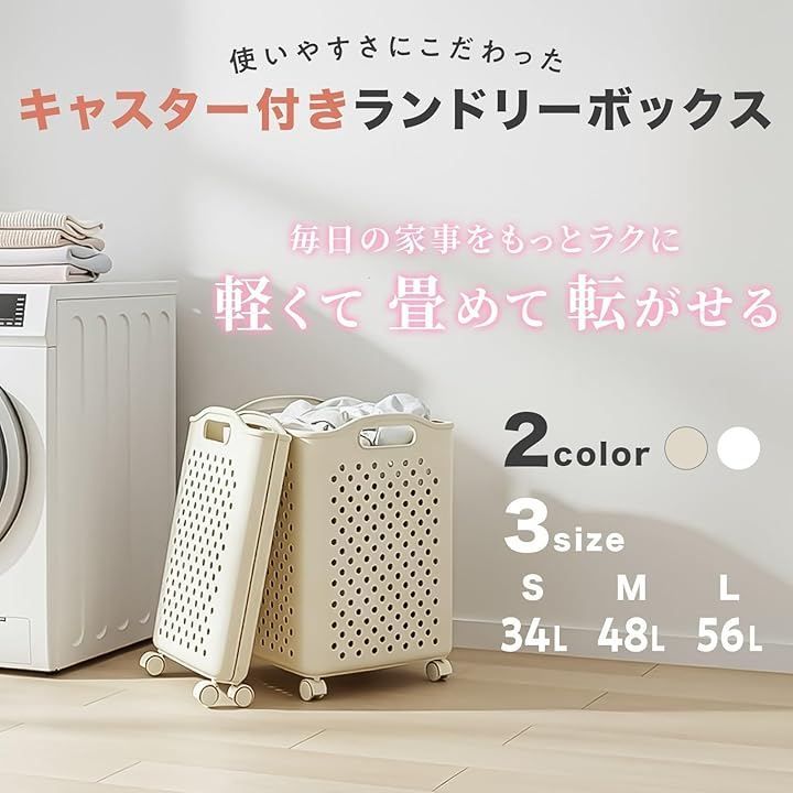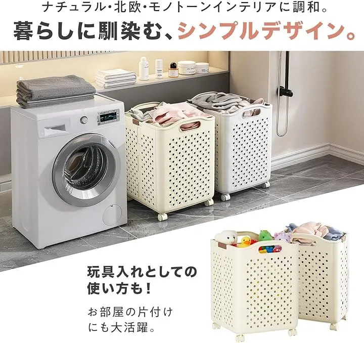「大容量で使いやすい洗濯カゴ」 大容量設計の洗濯カゴは、洗濯物をしっかり収納できるため毎日の家事を快適にします。