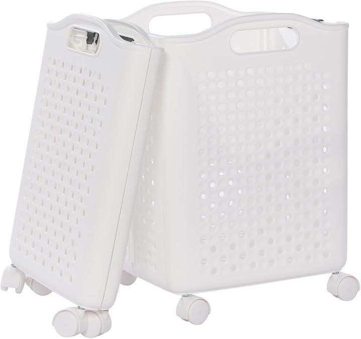 AZNABLE 折りたたみ10cmスリムx大容量 ランドリーバスケット 洗濯かご 洗濯物入れ キャスター付き PP素材 丈夫 丸洗い可 (ホワイト, Lサイズ)