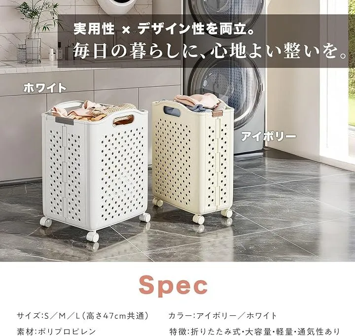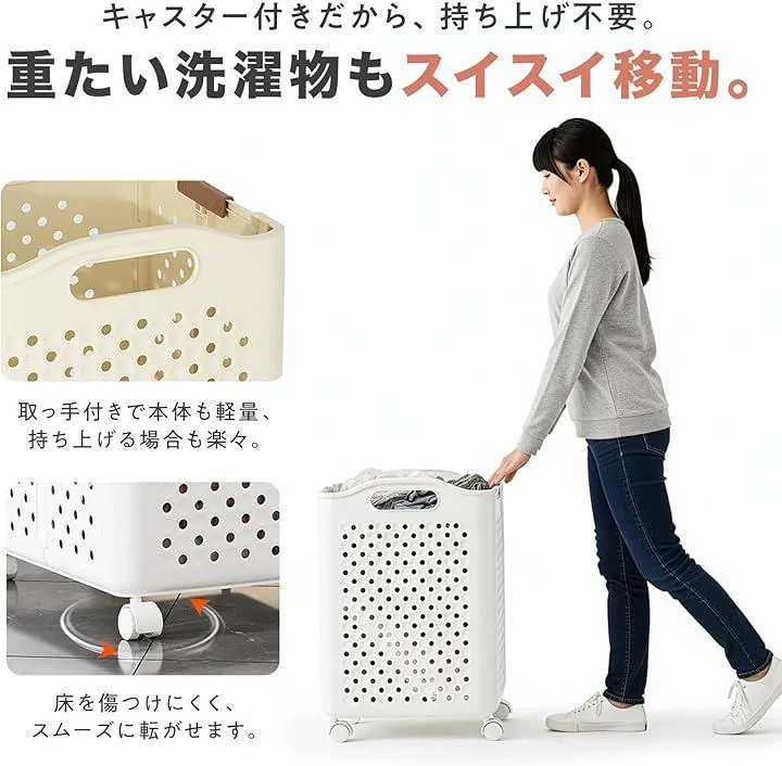 「大容量で使いやすい洗濯カゴ」 大容量設計の洗濯カゴは、洗濯物をしっかり収納できるため毎日の家事を快適にします。