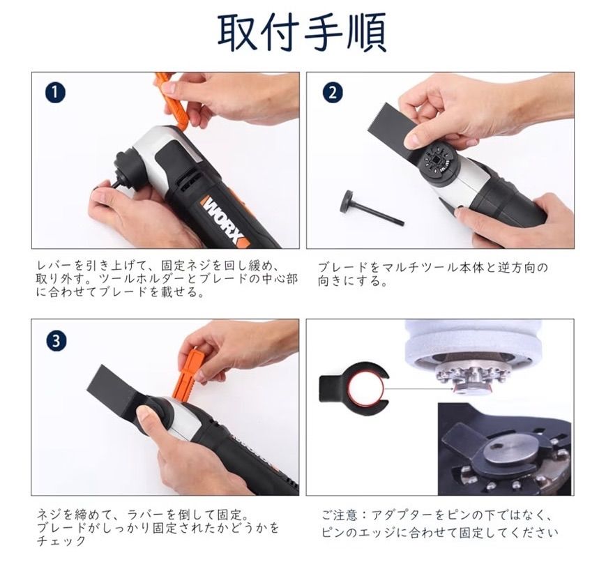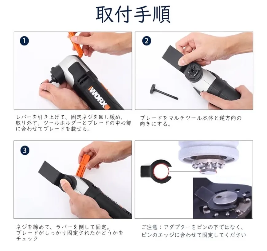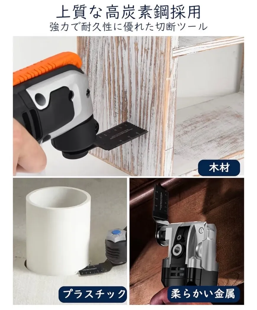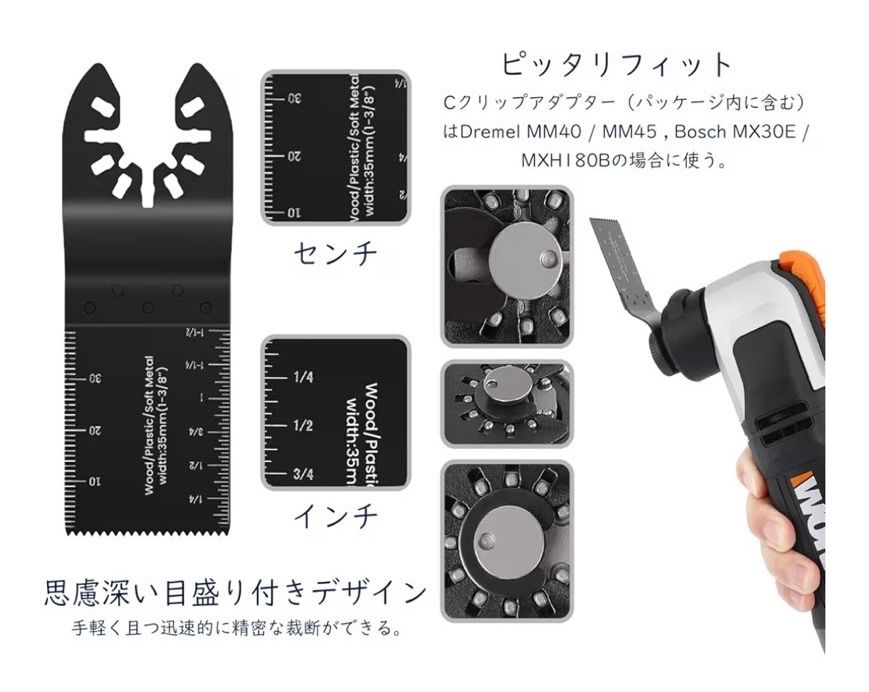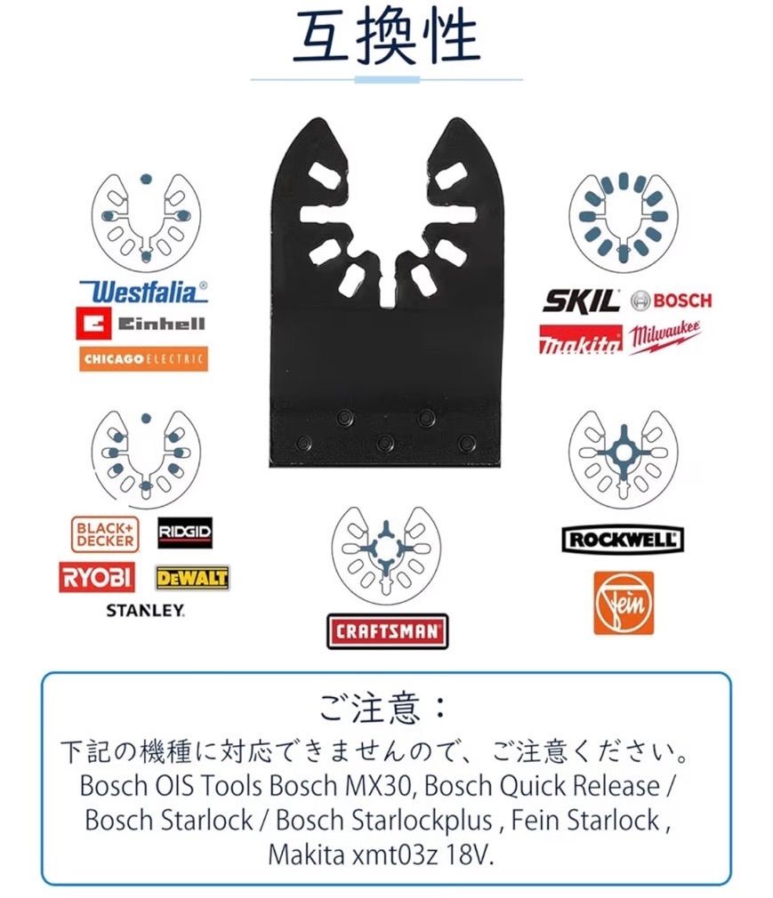 「幅広い互換性を実現」本品は、マキタ、ボッシュ、日立をはじめとする主要メーカーのマルチツールの大部分のモデルにご利用いただけます。ただし、Bosch MX30・Quick Release・Starlockシリーズ、Fein Starlock、Makita XMT03Z 18Vには対応しておりませんので、ご購入前には必ずお使いの工具との互換性をご確認くださいませ。また、Dremel MM40/MM45やBosch MX30E/MXH180Bなど、ツールのシャフトがブレードの穴よりも細い場合には、付属のCクリップアダプターをお使いいただくことで、しっかりと固定いただけます。