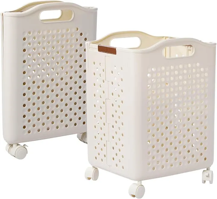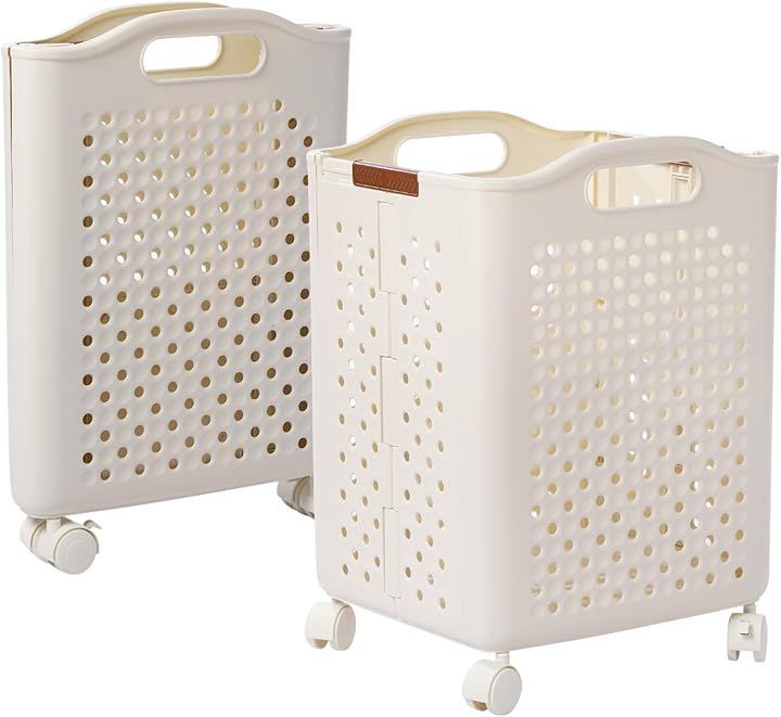 AZNABLE 折りたたみ10cmスリムx大容量 ランドリーバスケット 洗濯かご 洗濯物入れ キャスター付き PP素材 丈夫 丸洗い可 (アイボリー, Mサイズ)