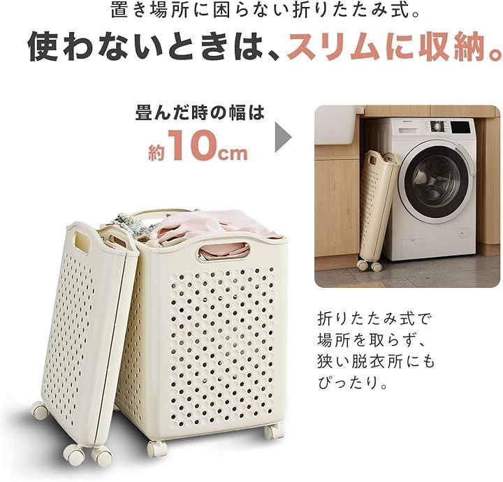 「折りたたみ式で省スペース」 ランドリーボックスは折りたたみ可能な構造で、未使用時はスリムに収納できます。
