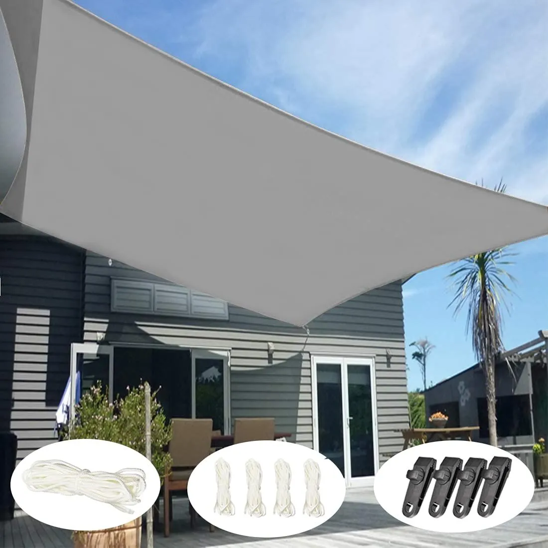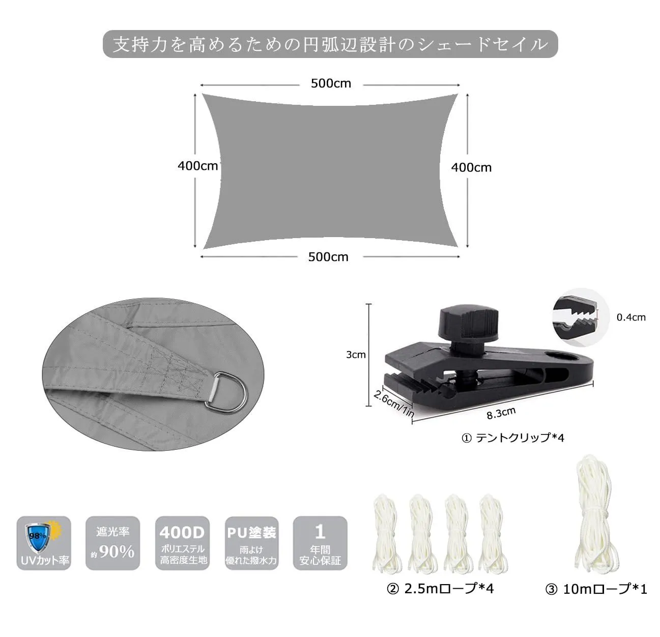 日除け シェード 雨よけ シート 日よけ サンシェード ベランダ 目隠し シェード 防水 撥水 クールシェード シェードセイル UVカット 紫外線 98%カット 庭 デッキ プール 窓ペ 天台 廊下 パーゴラ カーポート キャンプ (グレー, 4x6m)
