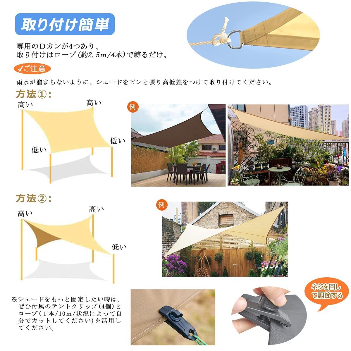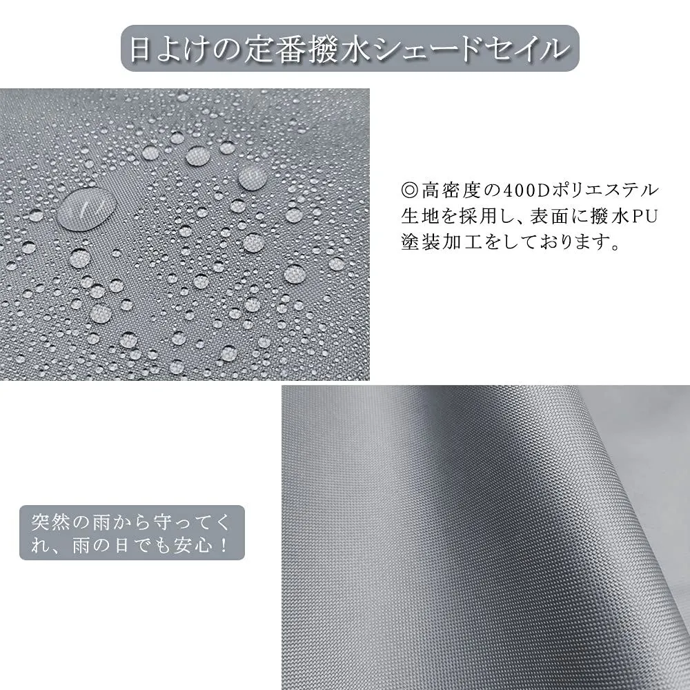 【優れた撥水力・雨よけ シェード】日除けの定番防水サンシェード。表面にPUコーティングを加工し、撥水レベル4級、優れた防水効果があり、突然の雨でも安心!
