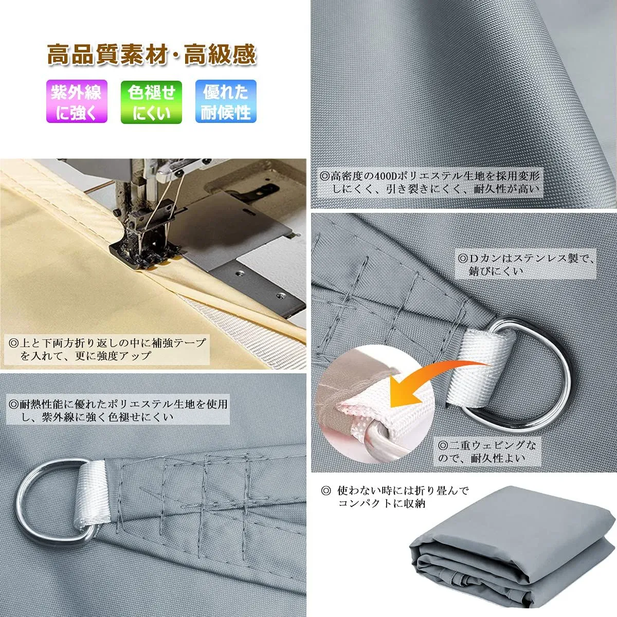 【高品質の生地】紫外線に強く色褪せにくいポリエステル生地を使用、引き裂きにくい、風、熱、酸化、腐食および放射線にも強く、耐久性が高い。形状記憶加工し、変形しにくい、美し外観を持つ。使わない時、折り畳んでコンパクトに収納できる。