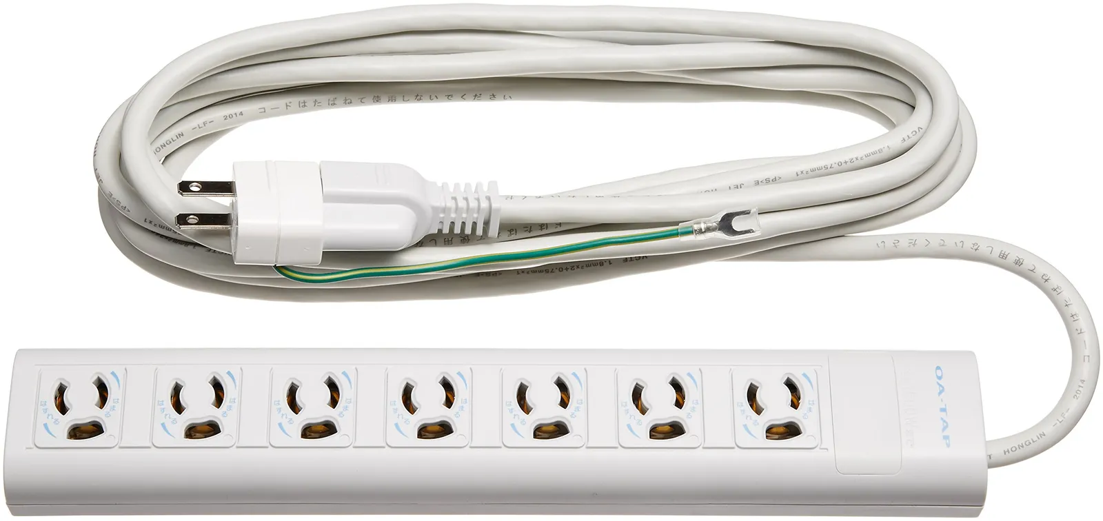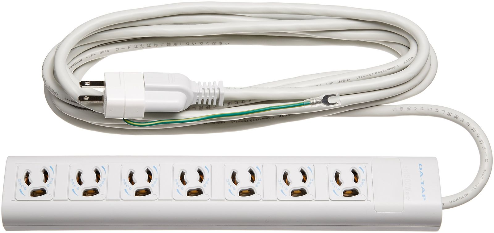 強力マグネット付。3P-2P変換アダプタ付。抜け止めコンセント。たっぷり7個口コンセント。