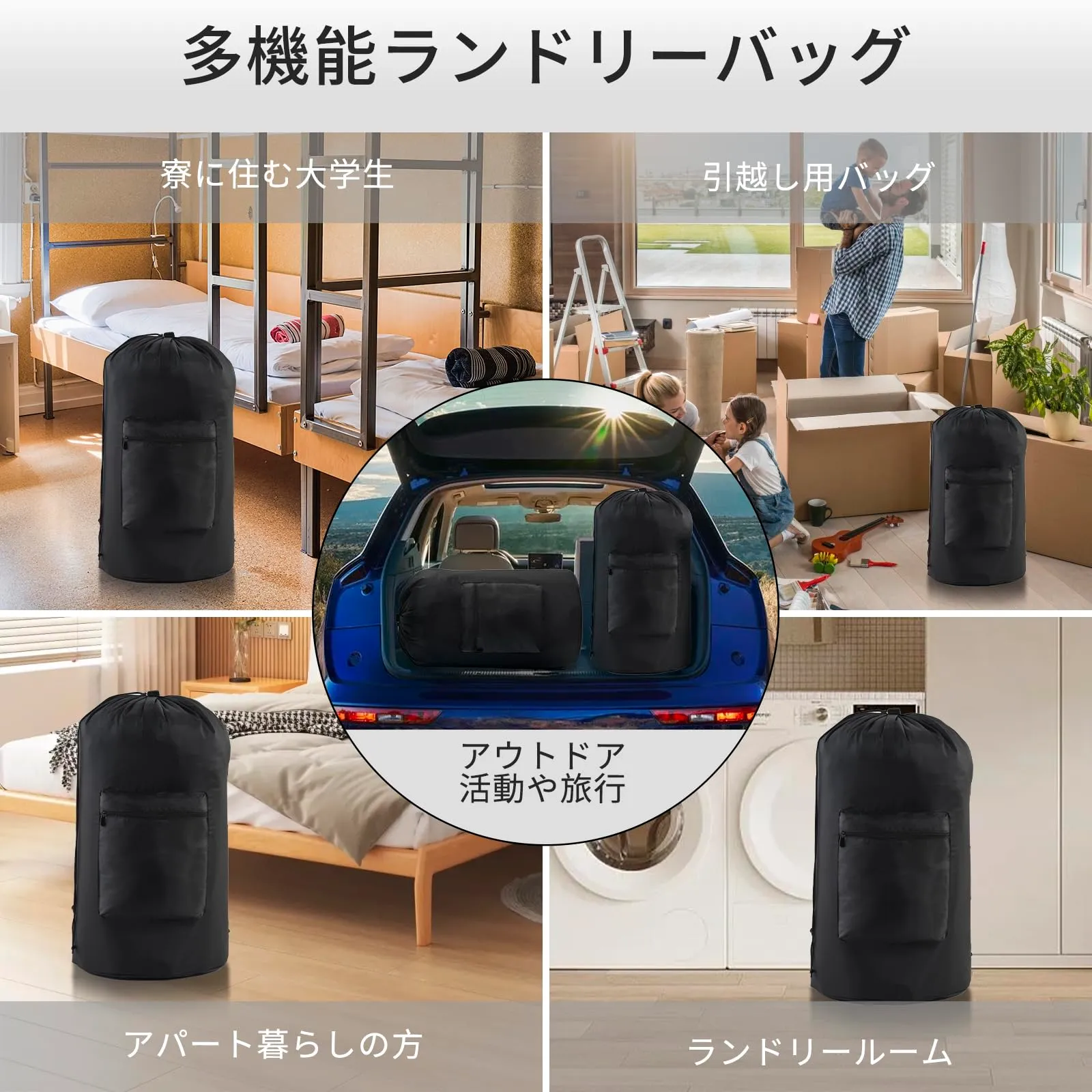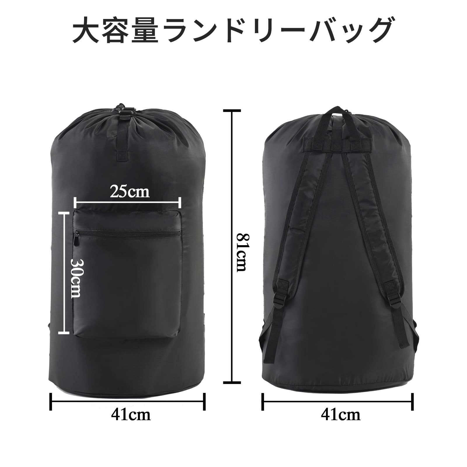 【大きなランドリーバッグ】広々としたメインコンパートメントとフロントポケットを備えたランドリーバックパックバッグは、洗濯に必要な十分な収納スペースを提供します。本体サイズは高さ81センチ x 長さ41センチ。コインランドリーや家族での使用に最適な容量で、3~4回分の洗濯物を楽に収納できます。