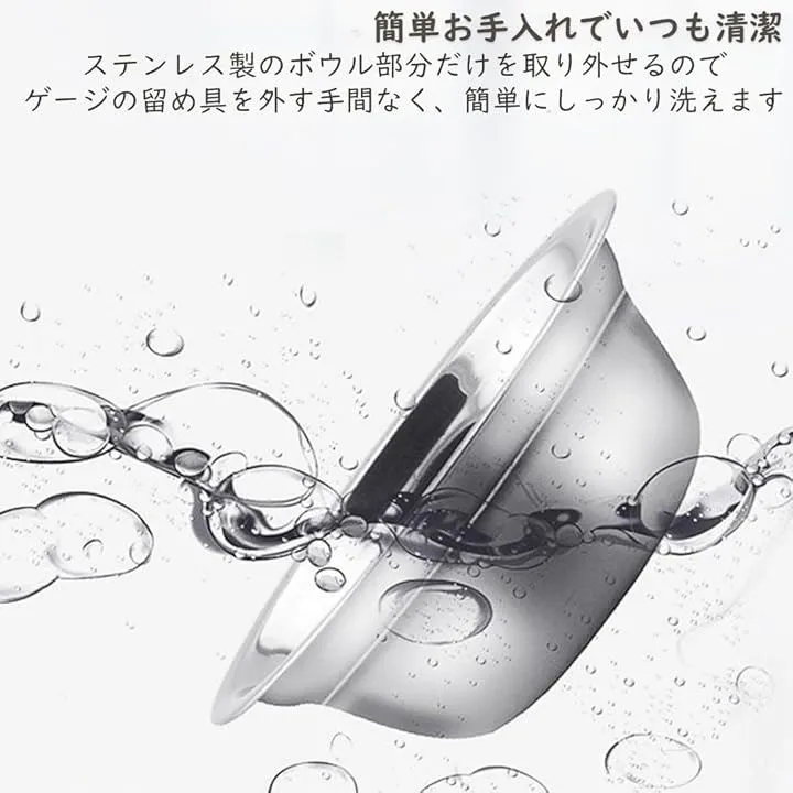 ケージに固定したまま、ステンレス製のボウル部分だけを取り外せるので、ゲージの留め具を外す手間なく、簡単に洗えます。