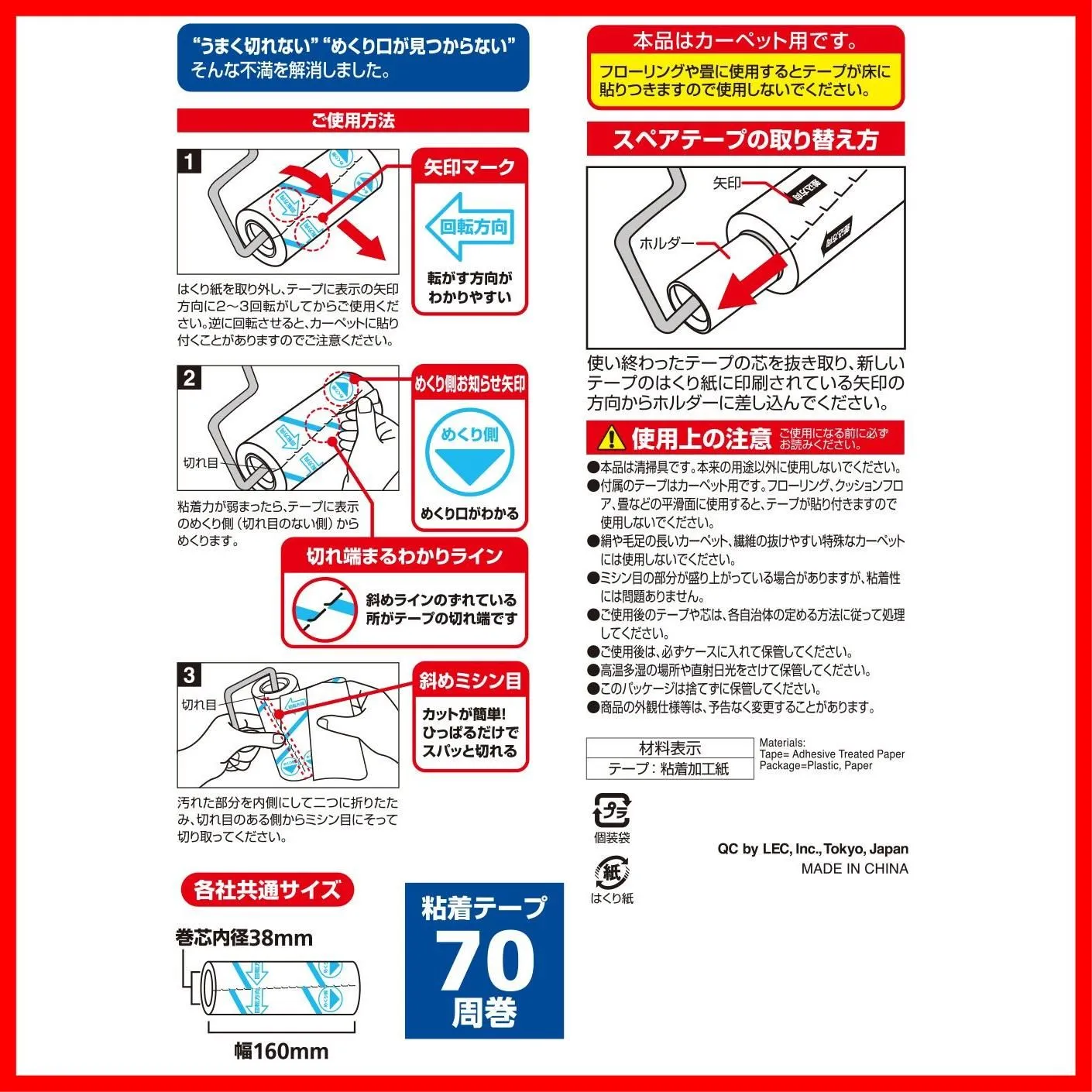 【 注 意 点 】 ・ フ ォ ロ ー頂 かないと確認が取れませんのでお手数お掛けしますが、ボ タ ン一つだけ ポ チ ッ とお願いいたします( * ?? ?*) ━━━━━━━━━━━ レック (LEC) 激コロ スゴ技カット 70周 スペア 6個入 / カーペットクリーナー/めくりやすい / 本体サイズ: 16×5×5cm イライラ解消。テープをスパっと切れるスゴ技ななめカットで、途中で破れにくく1発でカットできる。 内容量:6個入 めくり口がわかりやすいめくり側お知らせ矢印:と切れ端まるわかりライン:が印刷されている。 「うまく切れない」「めくり口が見つからない」そんな不満を解消したカーペットクリーナー。 各社共通サイズです。 サイズ:16×5×5cm 内容:6本入
