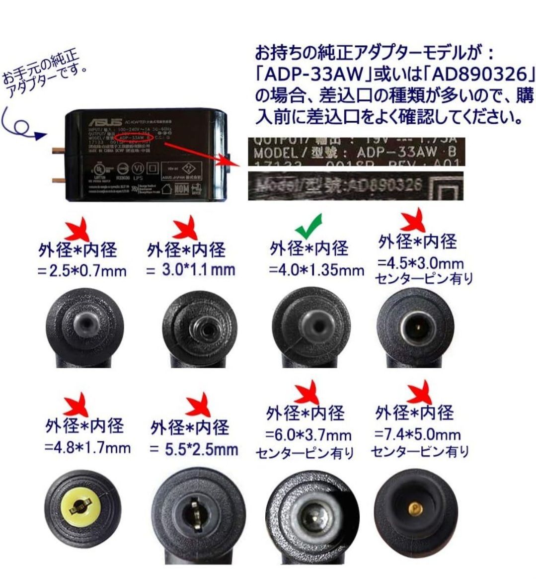 【商品規格】入力:AC100V-240V 出力:19V 1.75A 33W 差込口:丸型 外径 4.0mmФ 内径1.35mmФ ※ご購入の際はアダプターの規格(電圧、電流)およびプラグサイズ(外径、内径)をよくご確認ください。
