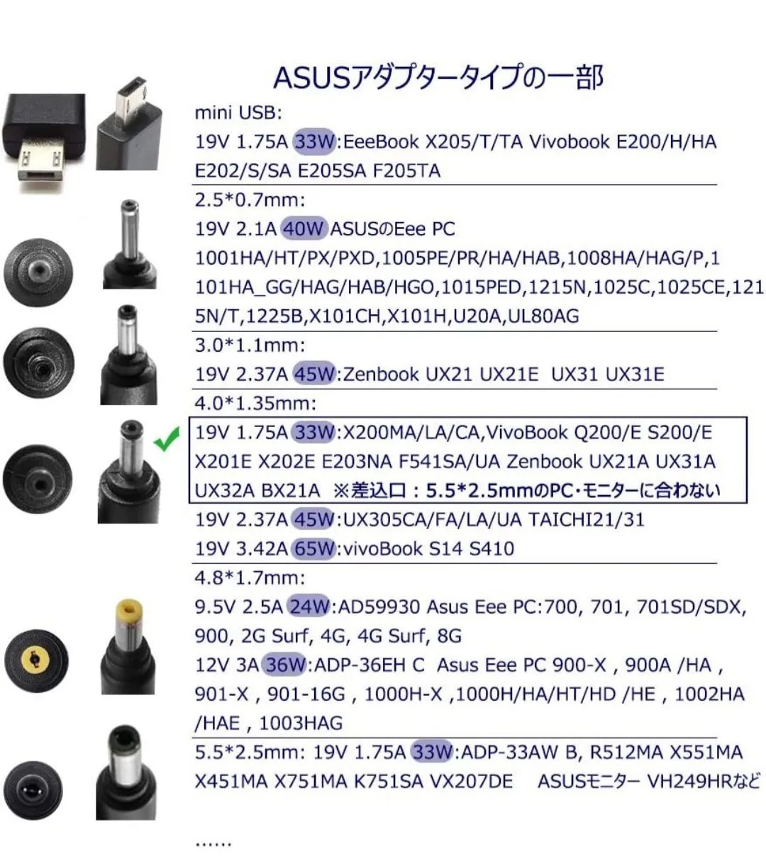 ★ASUS 互換電源 19V 1.75A 33W ACアダプタ エイスース VivoBook S200E X200CA X200MA X202E などに対応 プラグ:4.0*1.35mm