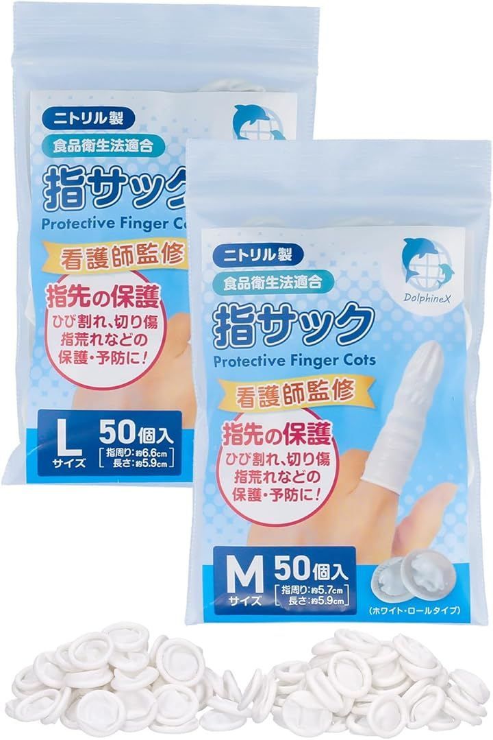 DolphineX お得セット看護師監修 指サック 使い捨て 指先保護 伸縮性ありニトリル製だからゴム臭なくアレルギーが起こりにくい食品衛生法適合 (ホワイト, M, Lセット(各50個入))