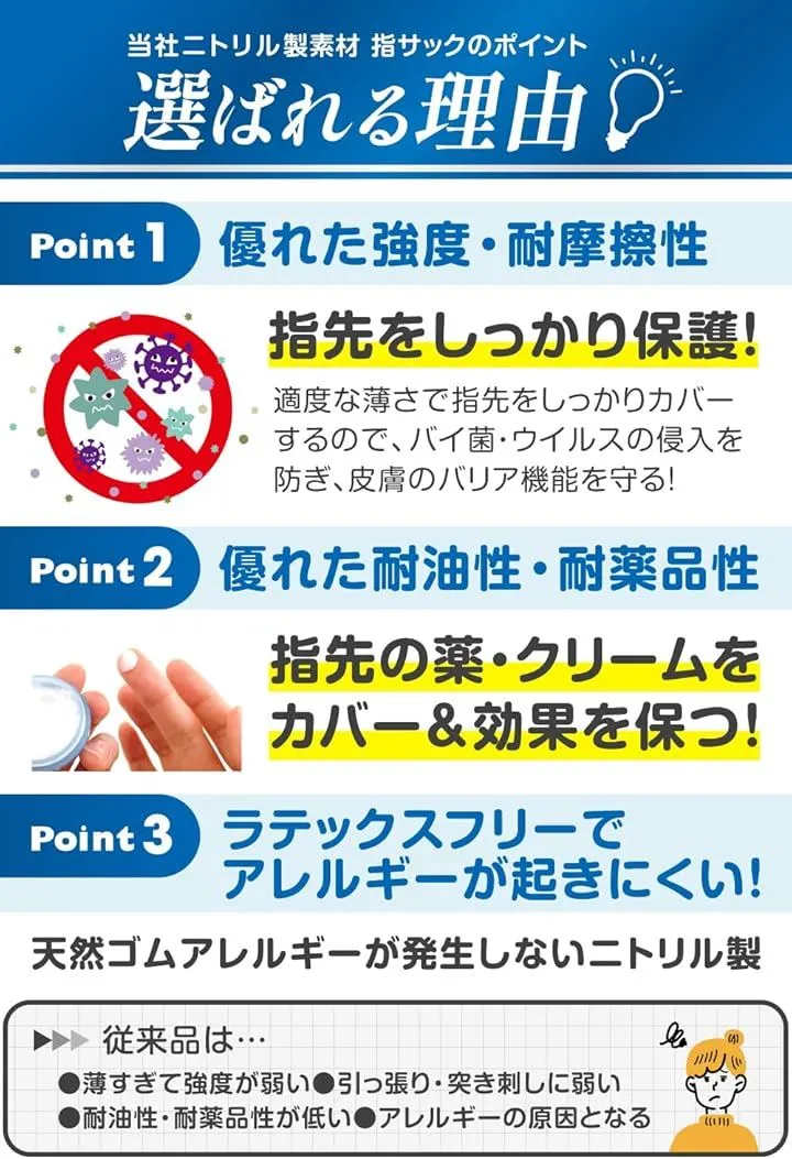「指先にぴったりフィット」既存のニトリル製指サックの伸縮性を改良し、よりフィットする仕様にしました。