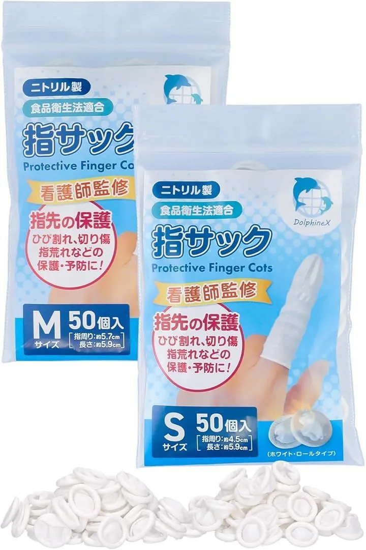 DolphineX お得セット看護師監修 指サック 使い捨て 指先保護 伸縮性ありニトリル製だからゴム臭なくアレルギーが起こりにくい食品衛生法適合 (ホワイト, S, Mセット(各50個入))