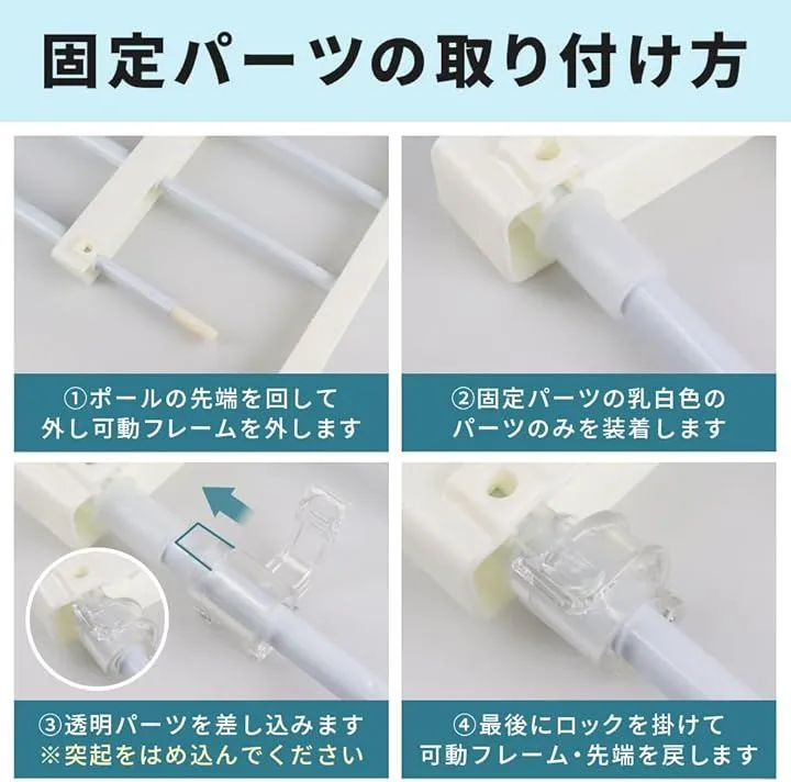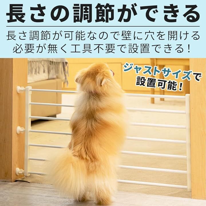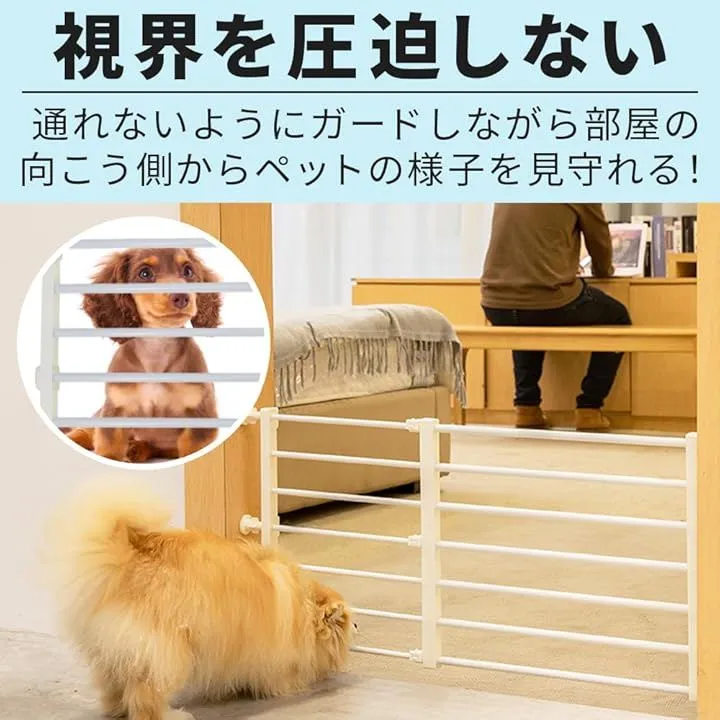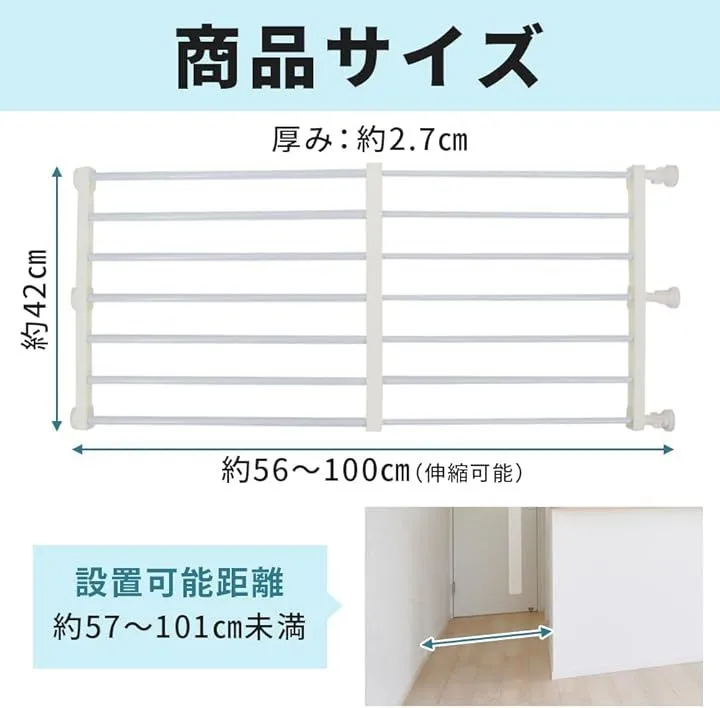 「セット内容」ペット用フェンスx1点 シリコンキャップx6点 伸縮固定パーツx3点 「サイズ(約)」高さ:42cm 横幅:56cm~100cm(伸縮調整可能) 厚さ:2.7cm 「カラー」ホワイト 「材質」炭素鋼+プラスチック