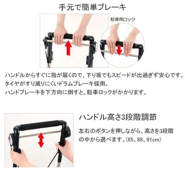 ●標準機能/折りたたみ、3WAYキャスター(360°・左右45°、固定)、手元ブレーキ、駐車ブレーキ、座面、杖・傘立て