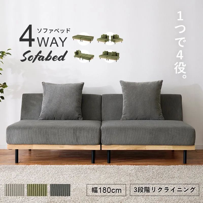 4WAY ソファベッド コーデュロイ 幅180cm 3人掛け 分割式