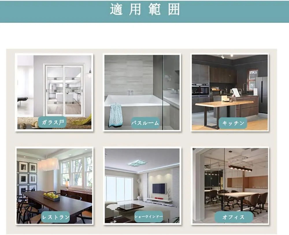 【適用ガラスタイプ】全ての滑らかな表面(凹凸がない)ガラスに適用です。木材、タイルやすりガラスなど粗い表面と多孔性表面のガラスに適用しません。ペアガラス(二重ガラス)と網入りガラスみたいの構造でも、表面が平ら(ツイツル)でしたら、綺麗に貼れますので、ご安心ください。