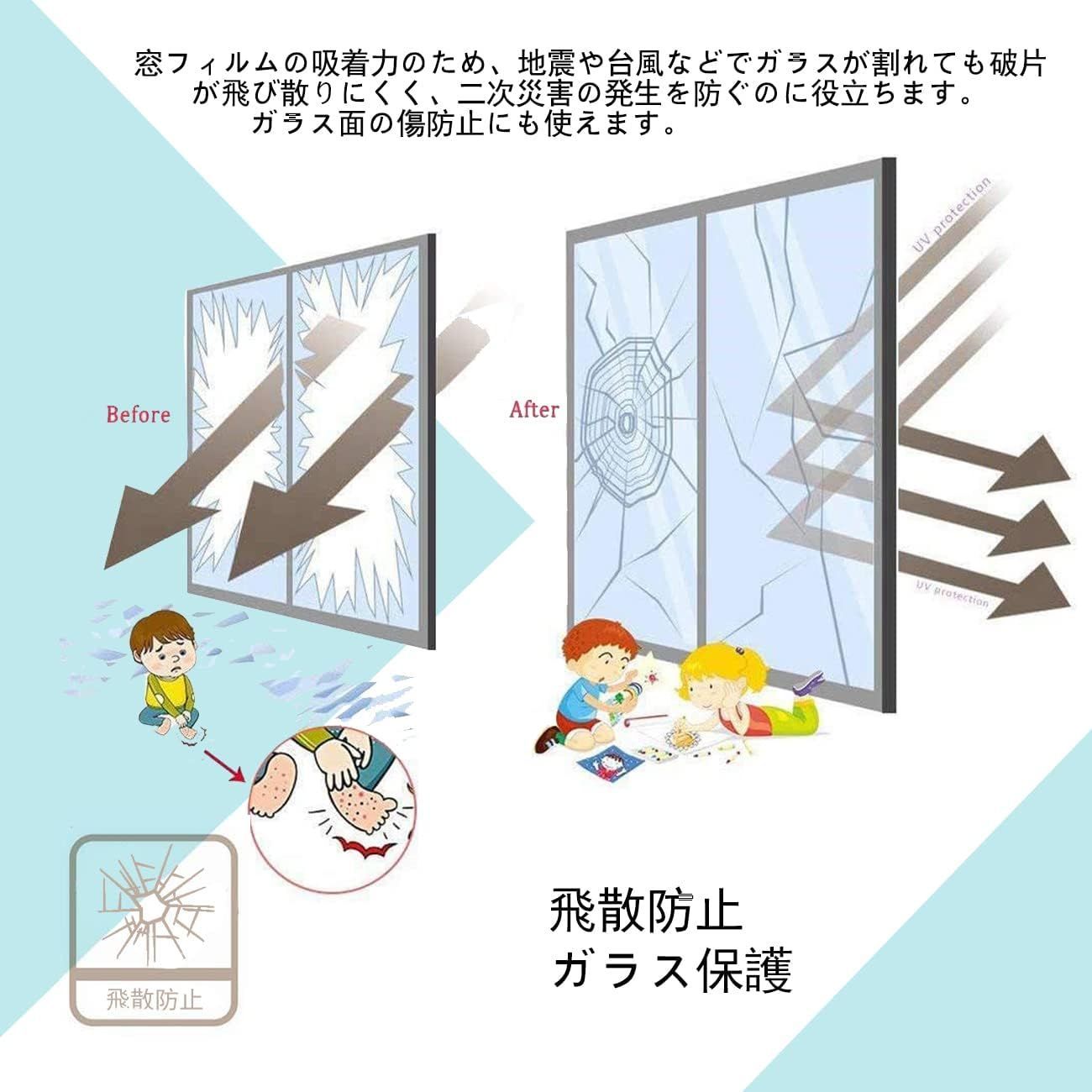 【断熱防寒・省エネ・飛散防止】:冬は暖房で暖めた室内の熱を窓から外へ逃げるのを抑え、暖房効率が向上させます。電気代の節約に役立ちます。そして地震や台風などでガラスが割れても破片が飛び散りにくく、二次災害の発生を防ぐのに役立ちます。