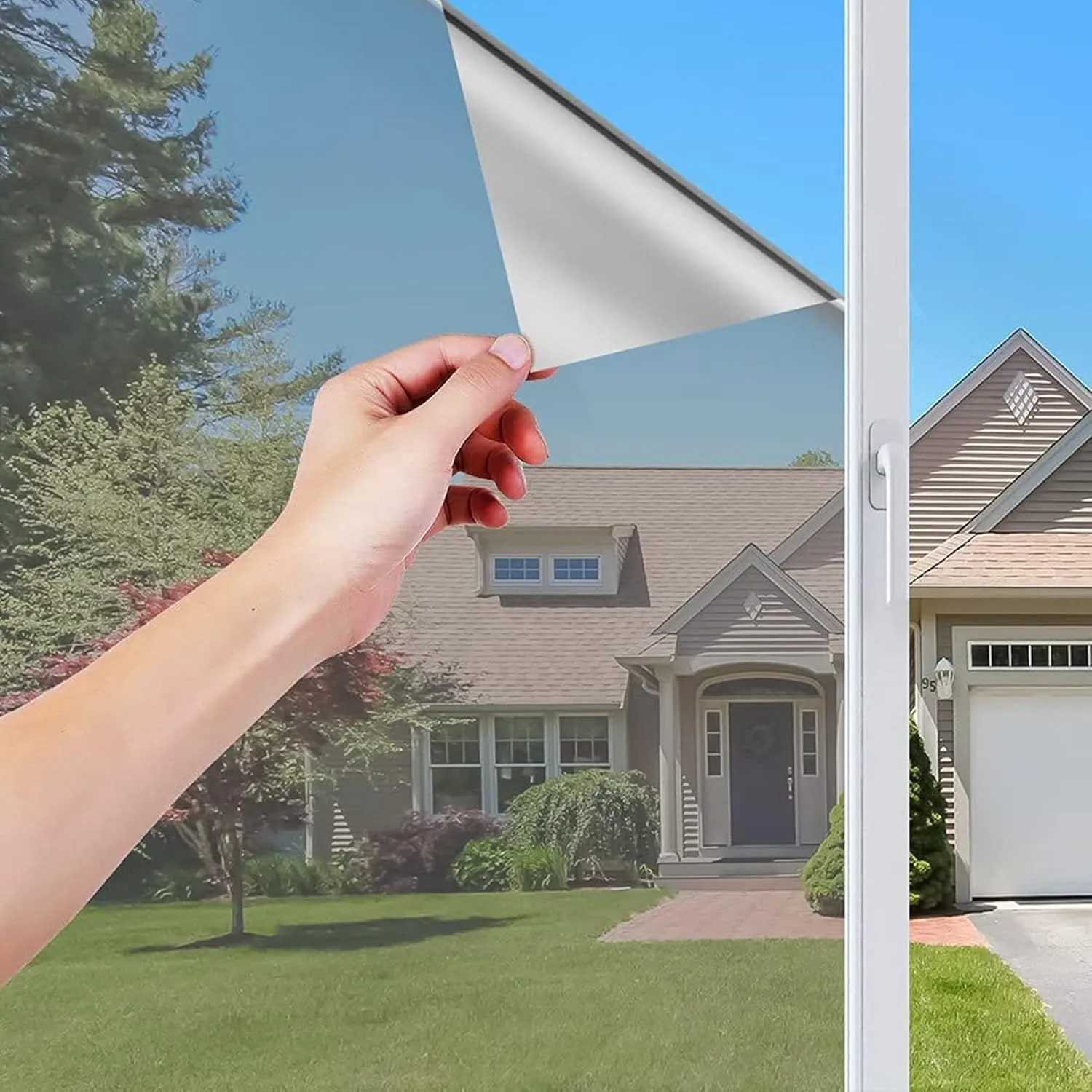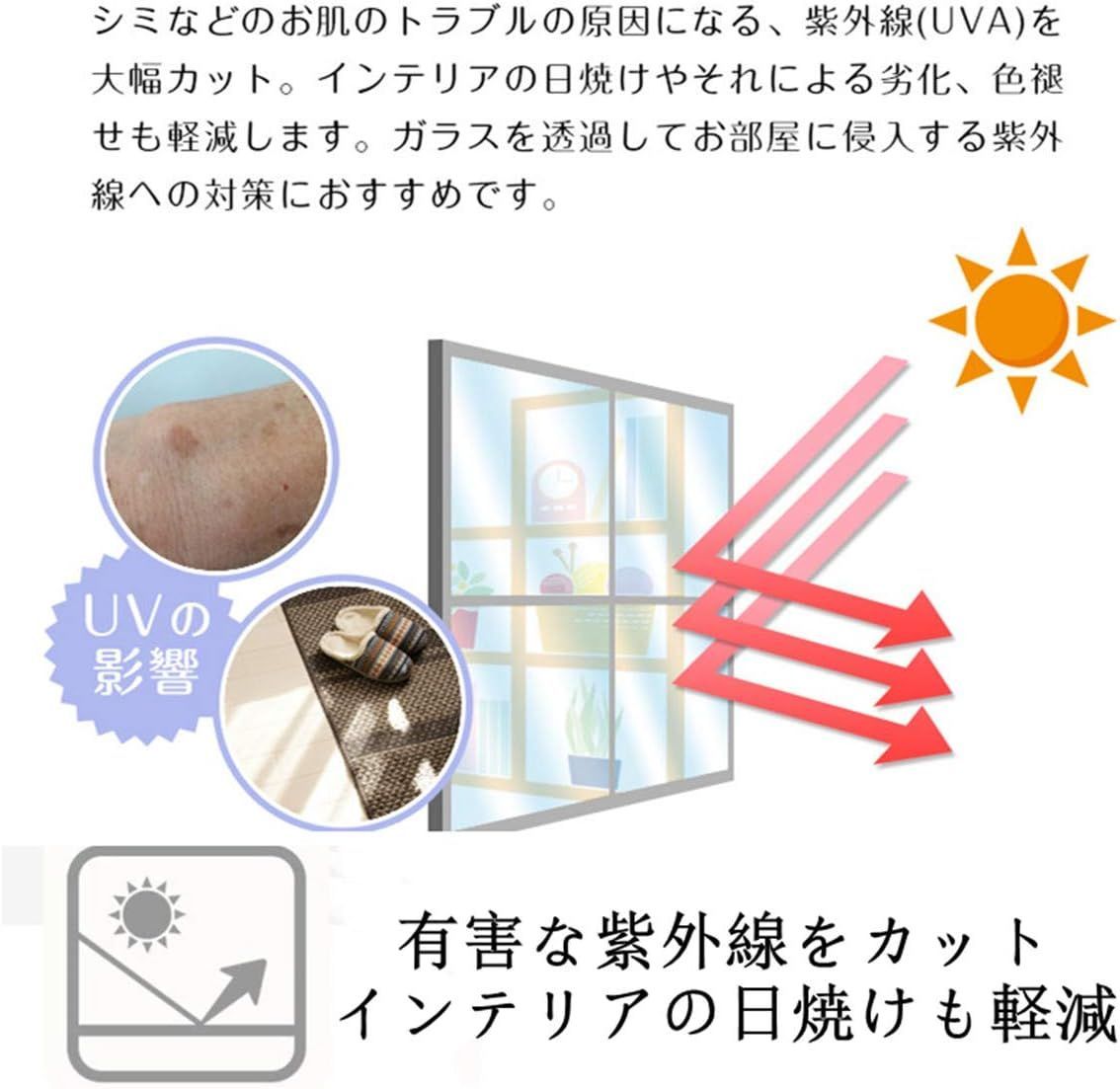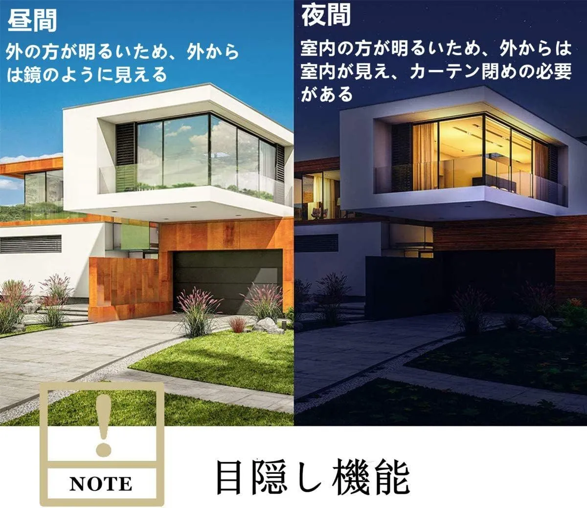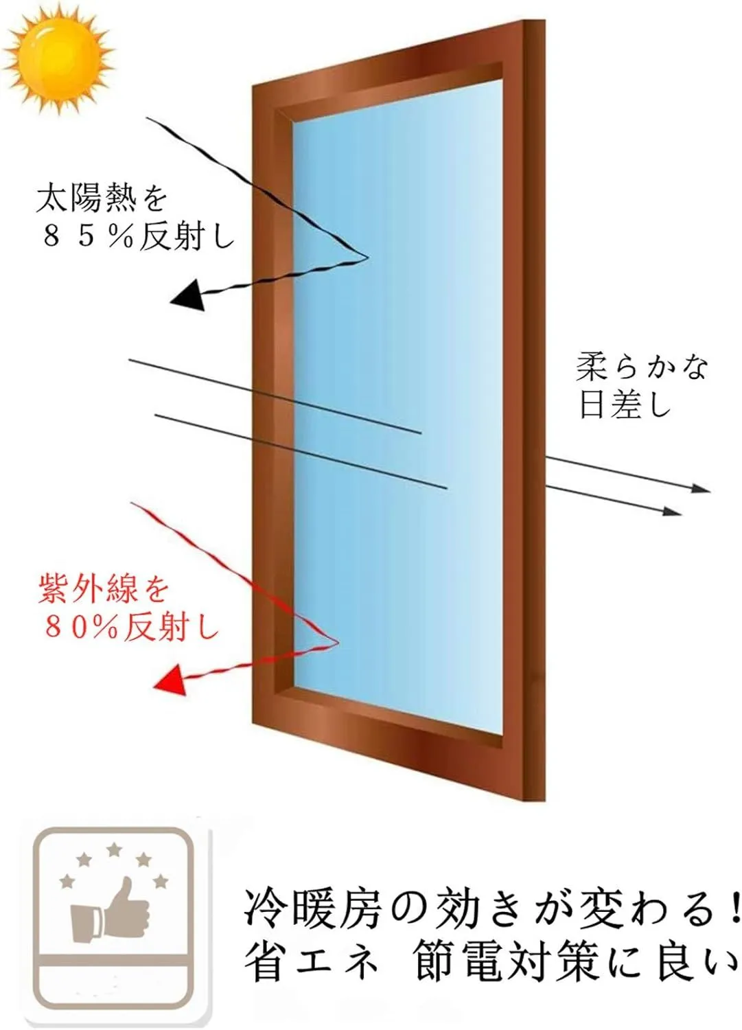 【マジックミラー機能、プライバシー保護】特別素材と加工の目隠しシートで外からの視線を遮りながら、充分に外の光を室内に取り込めます。カーテンを閉めているときの閉塞感や窮屈感あるの暗い部屋から解放されます。昼間は外から見ると鏡のように高い目隠し効果や防犯効果が優れています。室内から見ると、紺色の透明シートに見え、視界を損なわず、気軽に外の風景を眺めます。夜間や屋外が薄暗い時に室内の電気をつけると、ミラー効果は反転します(外から中が見えて外が見え難くなる)のでカーテンを引いてください。