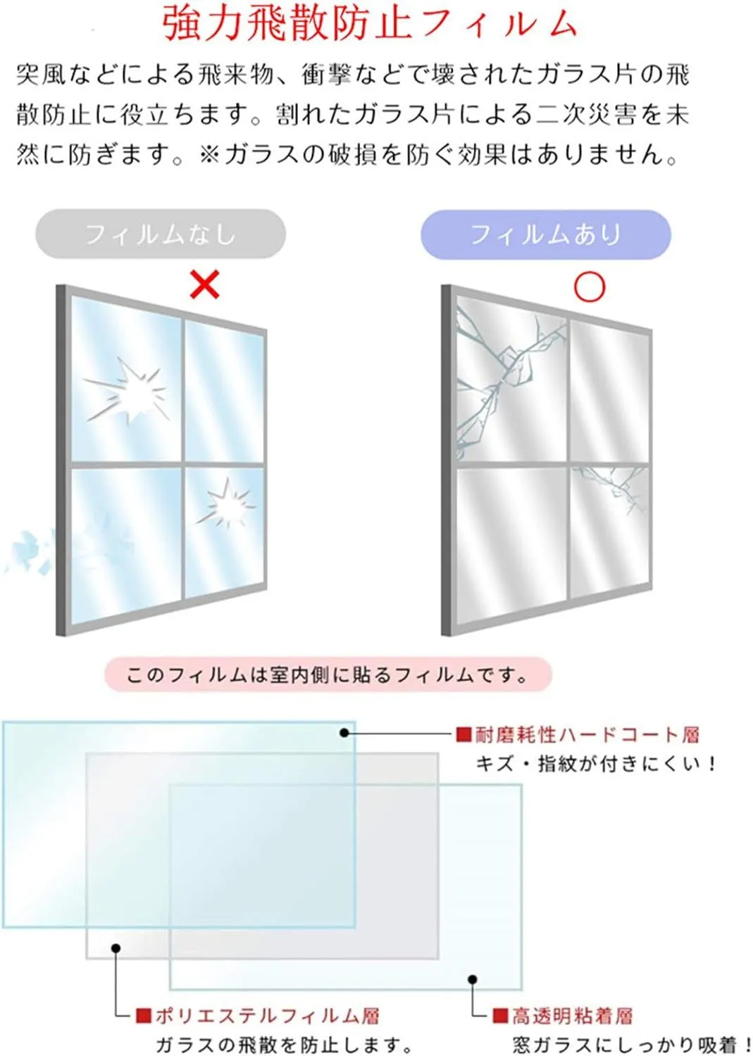 【飛散防止、省エネ節電】地震や台風などの影響でガラスが割れても、破片が飛散するのを防ぐ事で、避難経路の確保とけがの予防をする事ができます。夏は涼しく冬は暖かい!窓際の熱伝導率が低くなることにより、夏は冷気を外に逃させない、エアコン効率アップします。冬は暖気を室内に留め、暖房効率アップし、節電に役立ちます。日差しのきつい夏にも明るさが貴重な冬にも大活躍!