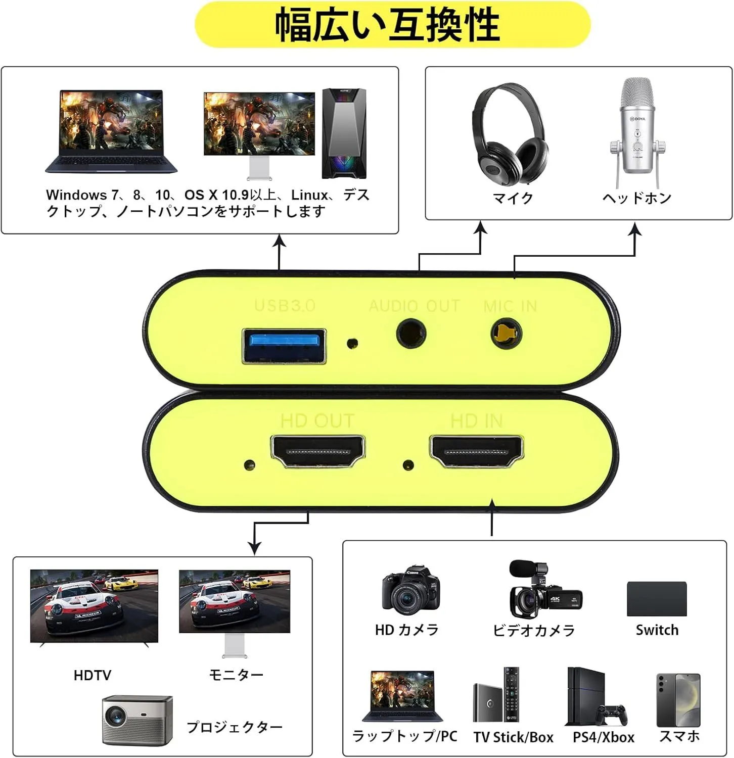 【幅広いデバイスに対応】このキャプチャーボード パススルーは、PS4、PS5、Xbox、Switch、Switch 2、Steam Deck、カメラ、ノートパソコン、デスクトップPCなど、さまざまなデバイスに対応しています。ゲーム配信、動画録画、オンライン会議など、多様なニーズにシームレスに適応します。