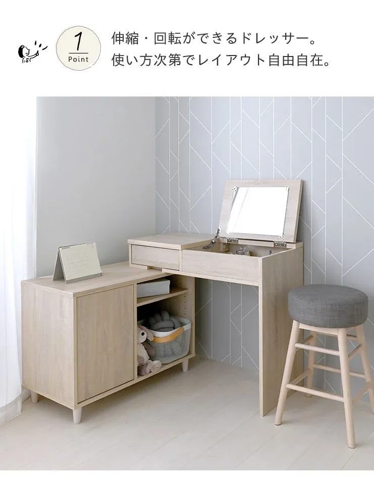 縮めればキャビネット、伸ばせばデスクドレッサーとして。 角度がつけられるので、お部屋のコーナーにも設置可能。