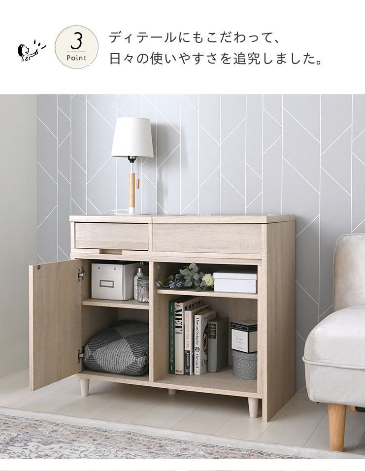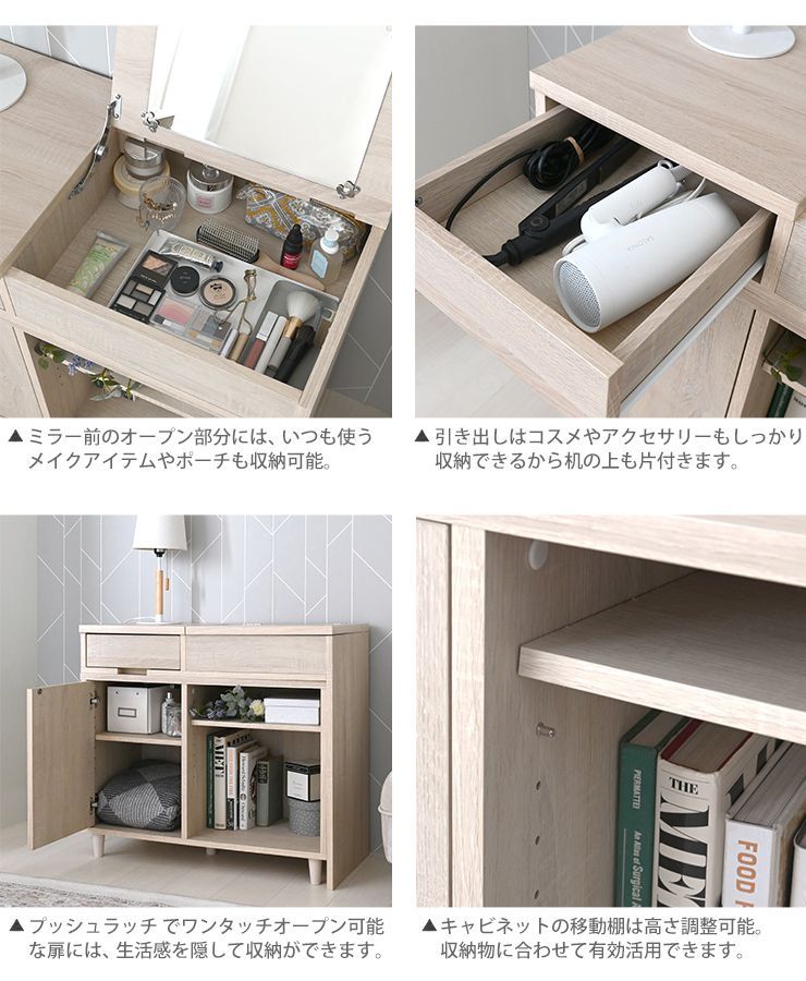 ミラー下にはコスメ、メイクツールやアクセサリーもしっかり入ります。 引き出し、扉内収納、可動棚付きオープン部分にはドライヤーやヘアアイロンだけでなく、 生活雑貨や書類、雑誌まで収納可能◎