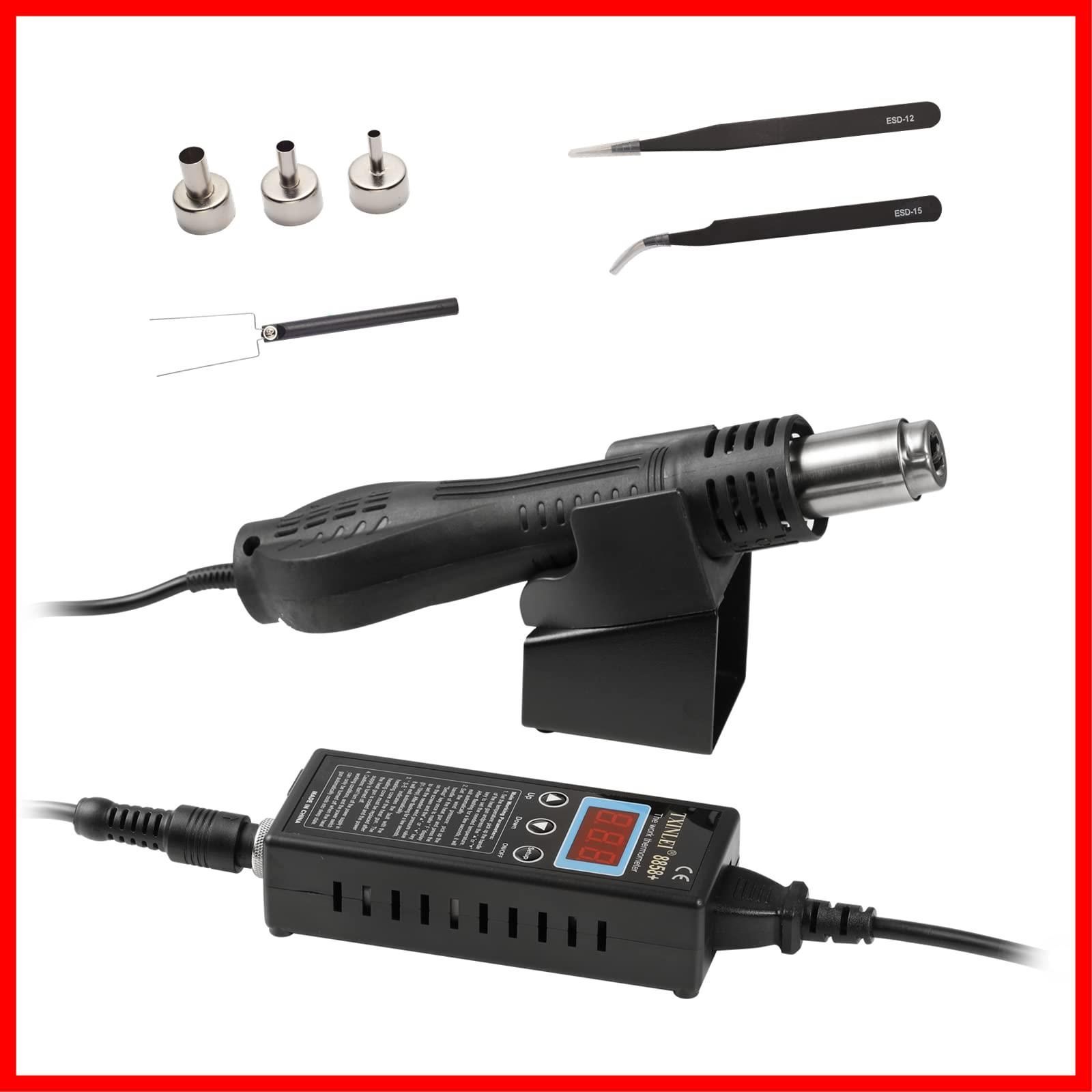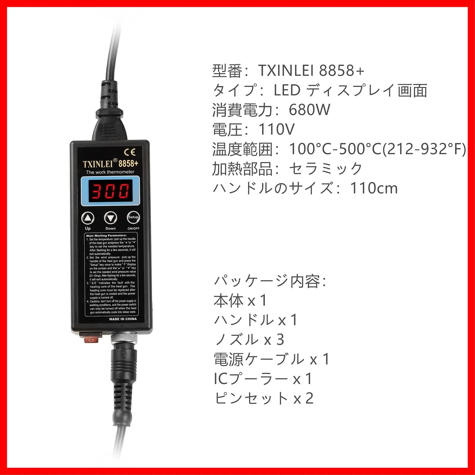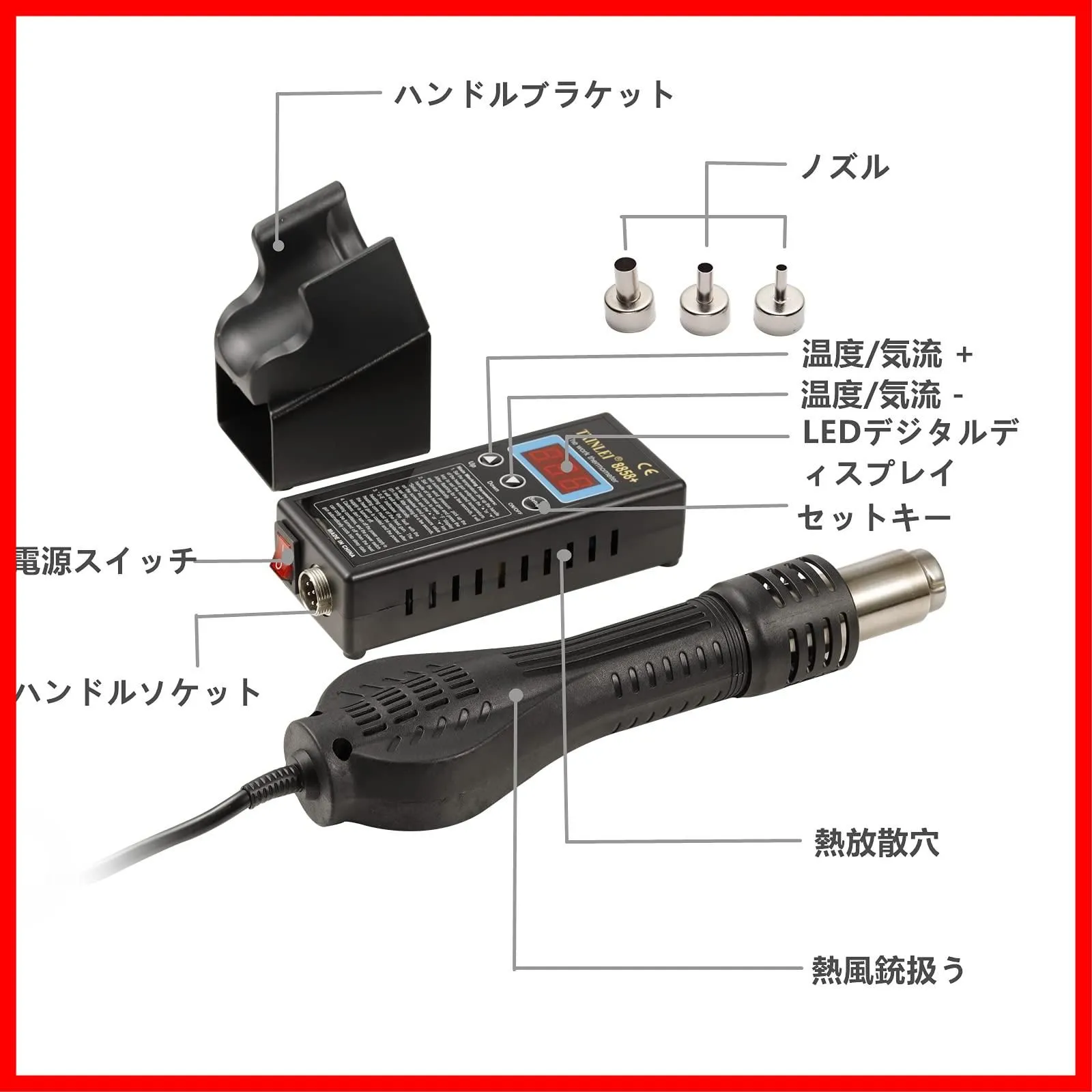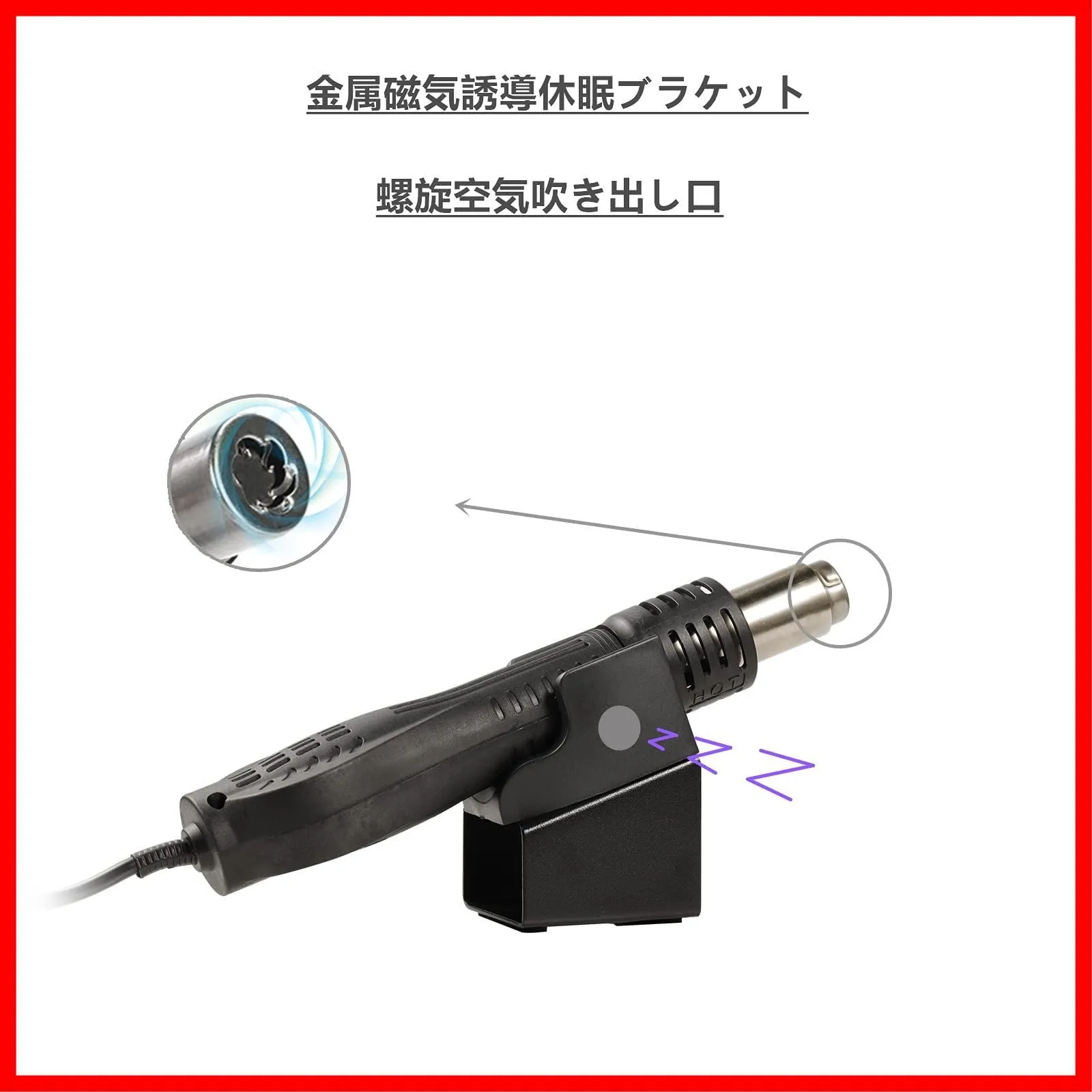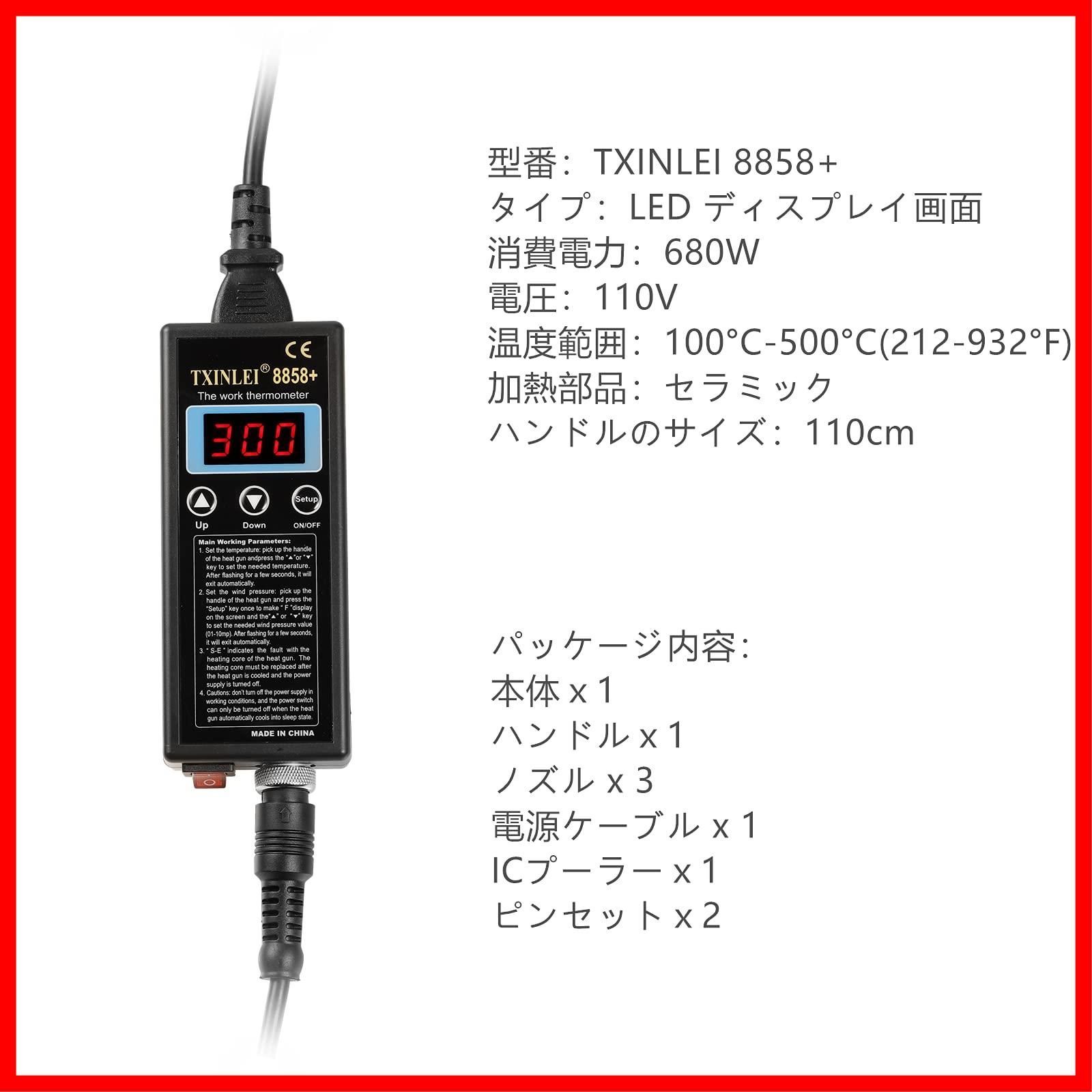 【広く使用】安全はんだQFP、PLCC、BGA、その他の温度に敏感な部品。 この度は TXINLEI 8858+ポータブルヒートガンをお買いあげいただきましてありがとうございます。 本製品は自社開発の SMT工芸修理に対応する新世代ポータブル溶接工具です。 耐久性が高い?赤外?発熱ユニットと特殊な温度センサーユニットを採用し、 マイクロ・コンピューターで精密に制御するホットランナー技術を利用し、ヒートガンの 温度制御曲線はSMT生産工芸の要求に満足できます。本製品は省エネ虹霓・コンパクト・長持ち・安全のメリットをお持ちします。 製品説明 型番:8858+ タイプ:LED ディスプレイ画面 消費電力:680W 電圧:(110V) 温度範囲:100°C-500°C(212-932°F) 加熱部品:セラミック ハンドルのサイズ:110cm 注意事項 1、本製品は高温作業ヒートガンですので、加熱ハンドルは必ず置き台に置いてください。やけどしないために作業台或いはほかの場所に置かないでください。 2、長時間使用しない場合に、必要しないロスを防止するように電源を切断してください。 3、電源を入れる時にはんだごてを挿し抜きしないでください。機器損害・感電の原因となります。 4、燃えやすいものの近くに利用しないでください。 パッケージ内容: 本体x1 ハンドルx1 ノズル x 3 電源ケーブル x 1 ICプーラーx1 ピンセットx2 日本語取り扱い説明書x1 ━━━━━━━━━