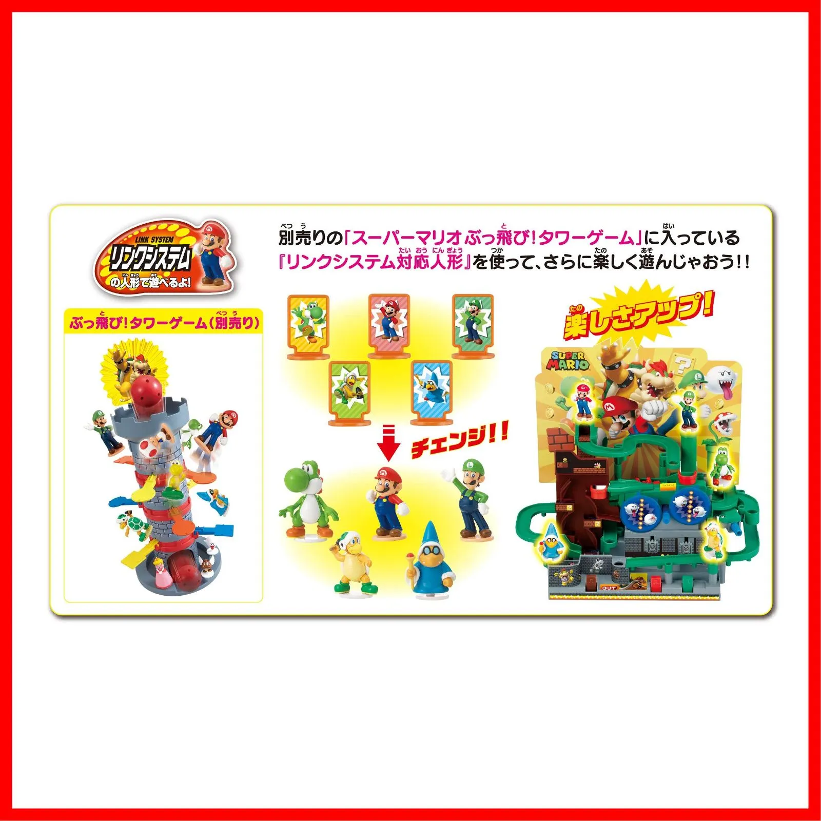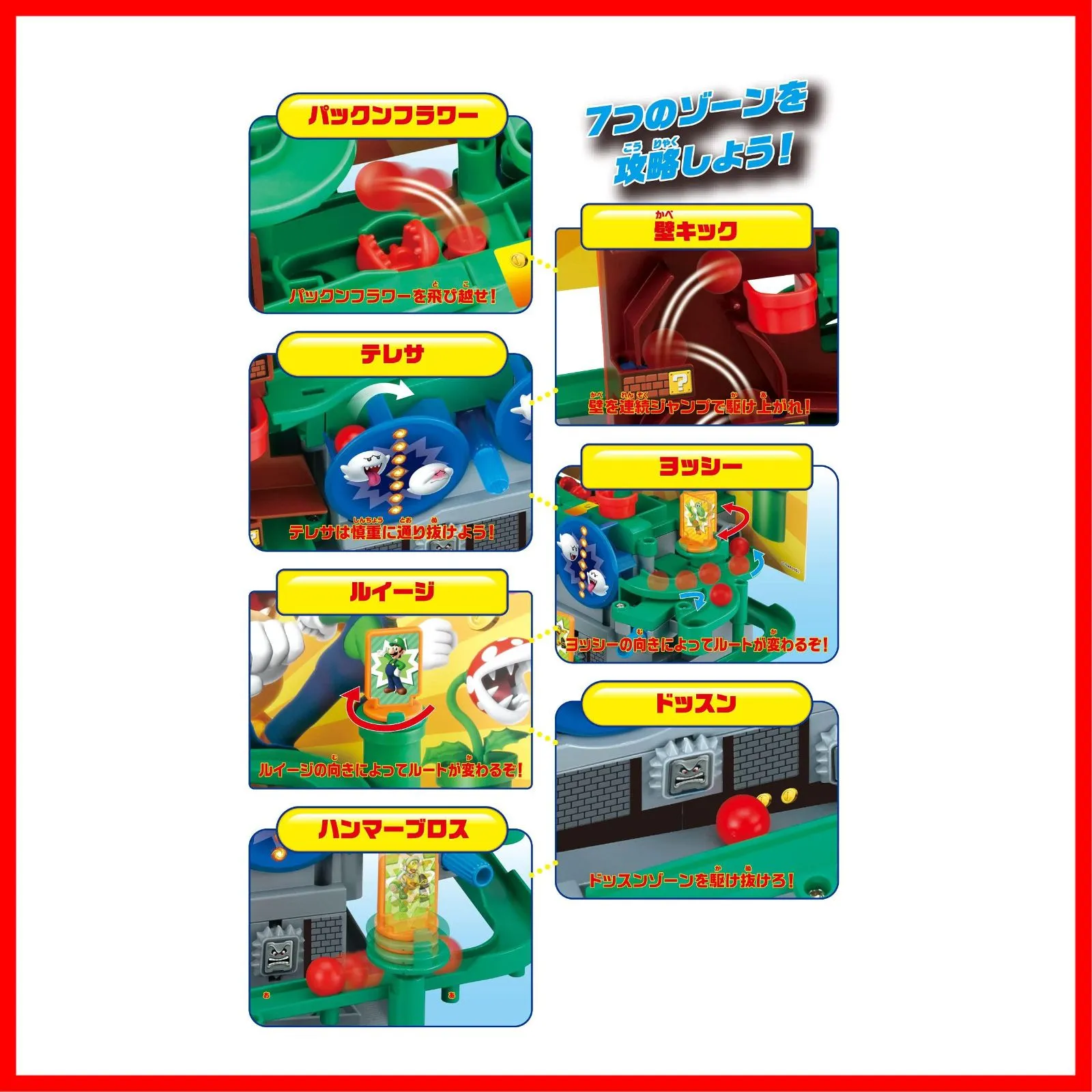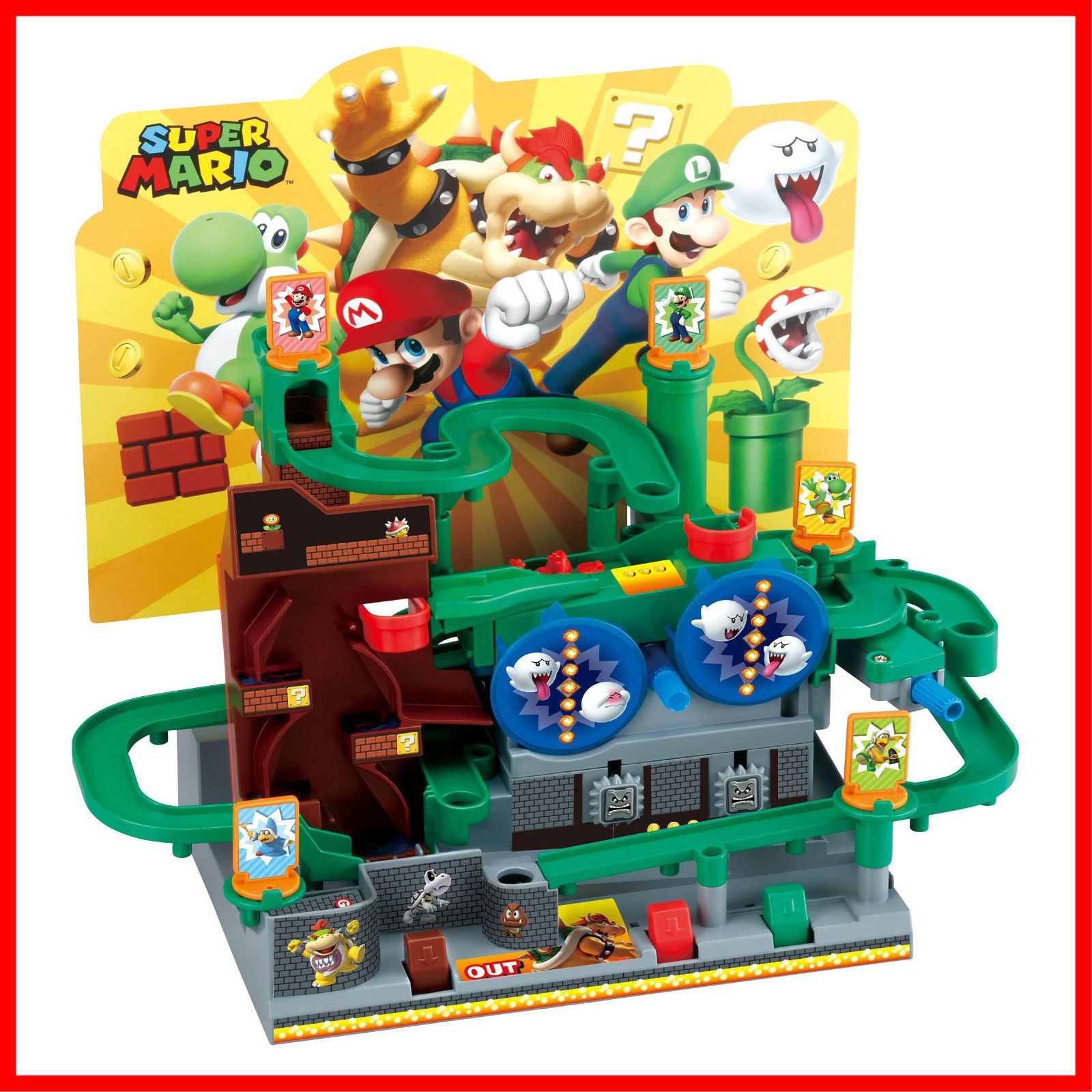 【 注 意 点 】 ・ フ ォ ロ ー頂 かないと確認が取れませんのでお手数お掛けしますが、ボ タ ン一つだけ ポ チ ッ とお願いいたします( * ?? ?*) ━━━━━━━━━━━ エポック(EPOCH) 社 2人 スーパーマリオ 大冒険ゲームDX クッパ城と7つの罠! 本体サイズ:29x27.4x15.8cm 原産国:中国 (C)Nintendo (C) EPOCH 対象年齢 :5才以上 ジャンプボタンや、コースセレクターでボールを操り、クッパ城を攻略せよ! パックンフラワーやドッスンなど、次々と立ちはだかる敵をかわしてゴールを目指そう! 他にも壁ジャンプなど、「スーパーマリオ」でおなじみのトラップやギミックが盛りだくさん。 すべての仕掛けをクリアして、ゴールまでたどり着こう! マリオなど、おなじみのキャラクターがエキサイティングに冒険を盛り上げます。 キャラクターコマを「リンクシステム対応人形」にスイッチすれば、冒険がさらにグレードアップ! 別売の『スーパーマリオ 大冒険ゲーム マリオアタック! 』とつなげて遊べます。 [セット内容] 大迷路ゲームDX本体、空中コース、台座(A,B,C,D)x各1、キャラクタープレートx5、ボールx2、背景ボード、シール (より) 安全警告 ・小部品があります。誤飲・窒息の危険がありますので、3才未満のお子様には絶対に与えないでください。 ━━━━━━━━━