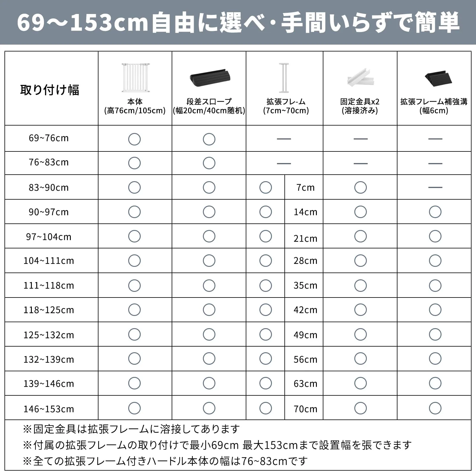 【全幅153cm&全配件付属:キッチン/螺旋階段に最適】 拡張フレーム(7-70cm)付属で幅69?153cm柔軟調整。「段差スロープ」「補強溝(90cm以上付き)」「溶接固定金具(溶接は延長)」を全付属。柱状階段にはY型ボルト(別売)で確実設置。