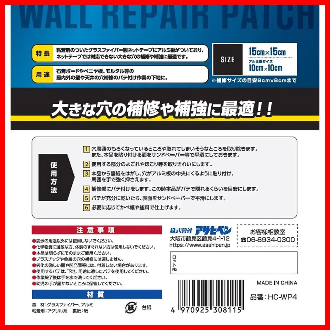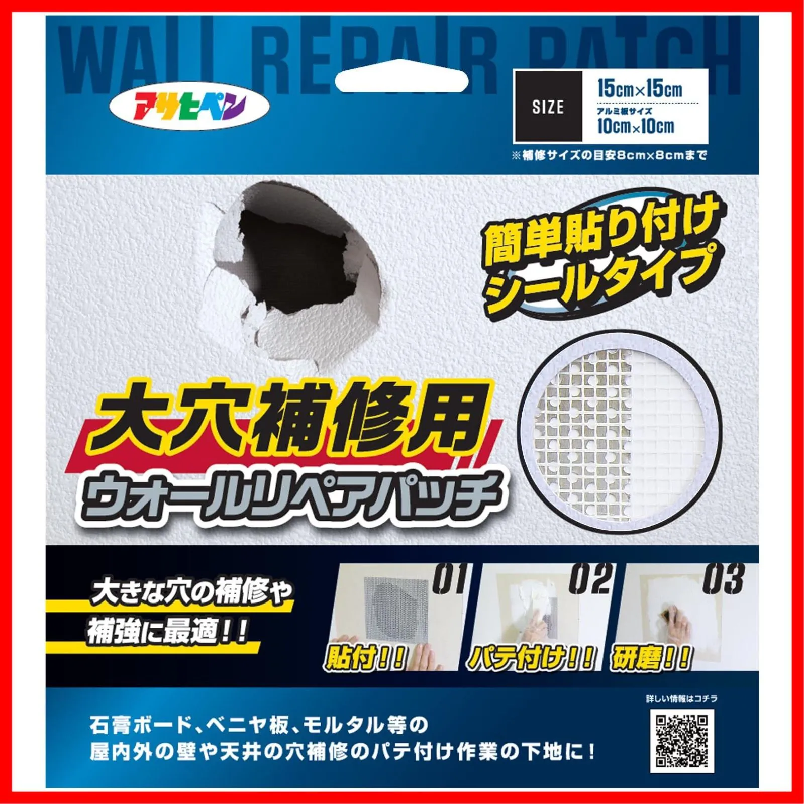 アサヒペン 壁穴補修 大穴補修用 ウォールリペアパッチ HC-WP4 15cm×15cm(アルミ板10cm×10cm) アルミ板入りプレート 穴埋め用 補修 補強 石膏ボード パテ埋め作業用 DIY