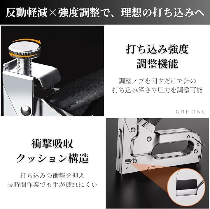「カラー」シルバーxブラック「サイズ」11.0x15.5x3.1cm/650g「素材」全鋼製+ソフトラバーグリップ「付属品」門型針200本・U型ステープル200本・T型針200本・直型針200本(合計800本)「対応用途」木工・家具張り替え・床材施工・壁紙固定・配線整理・バイクシート補修など