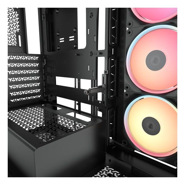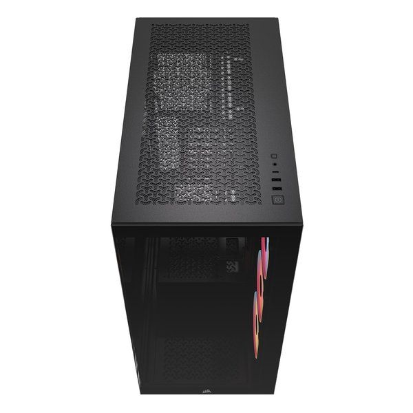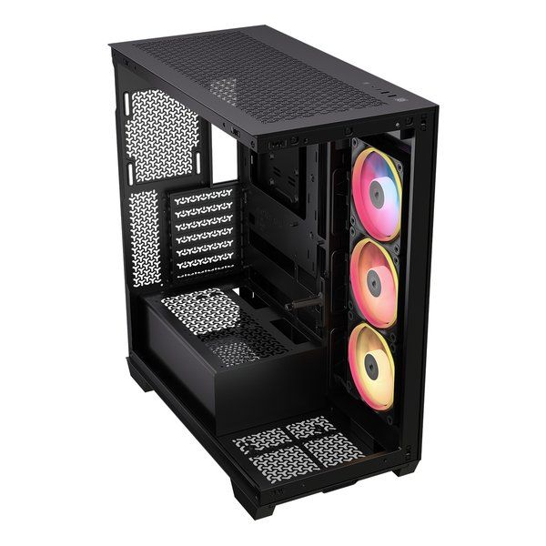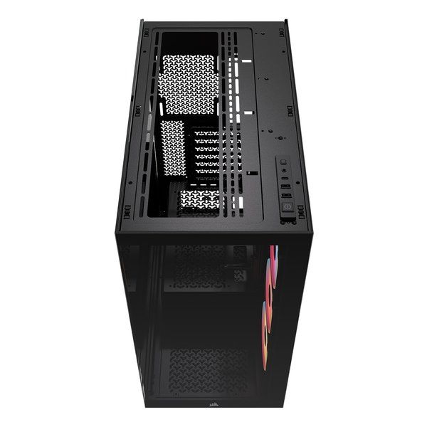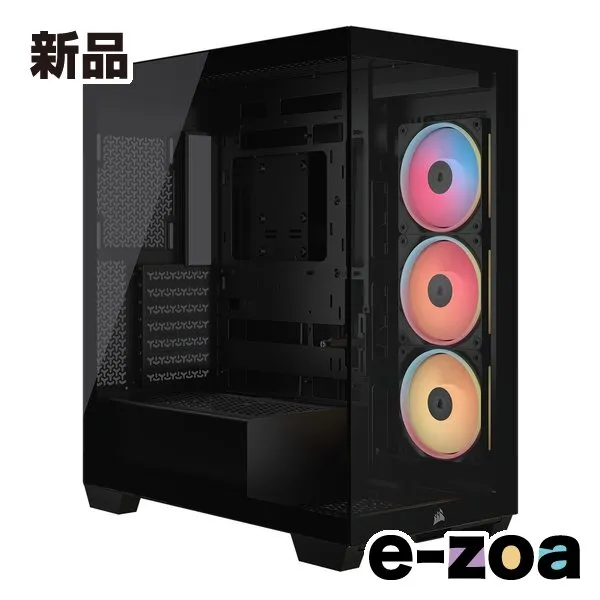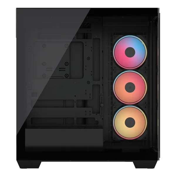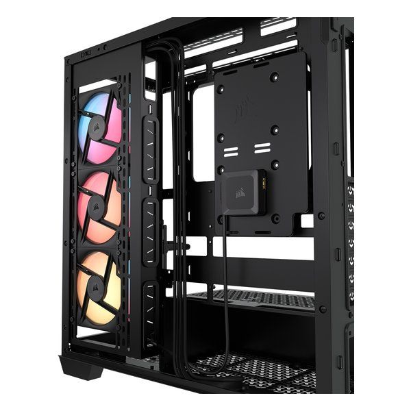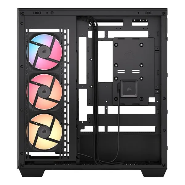 リバースローター設計のiCUE LINKファンを搭載。背面コネクタ設計のマザーボードに対応するピラーレスデザインのミドルタワー型PCケース