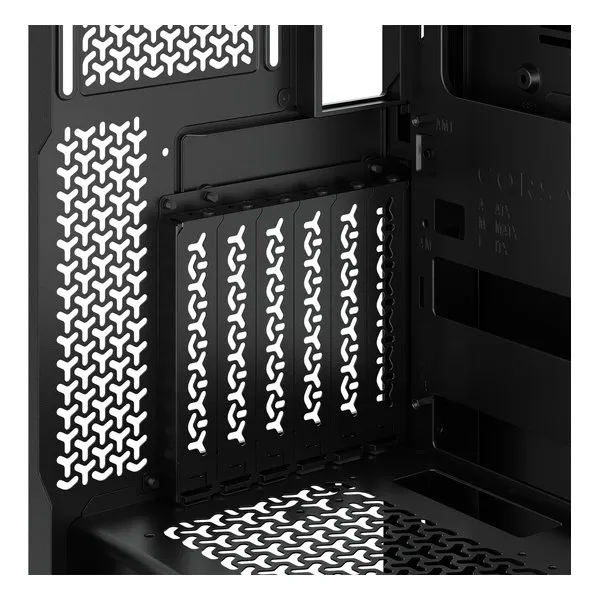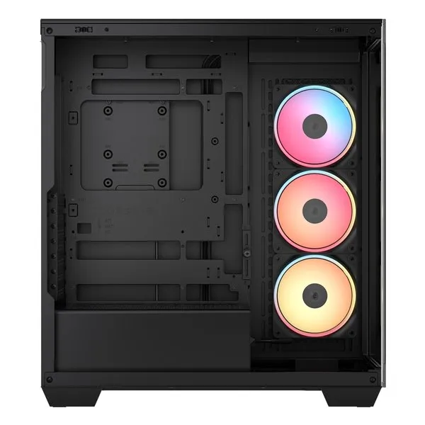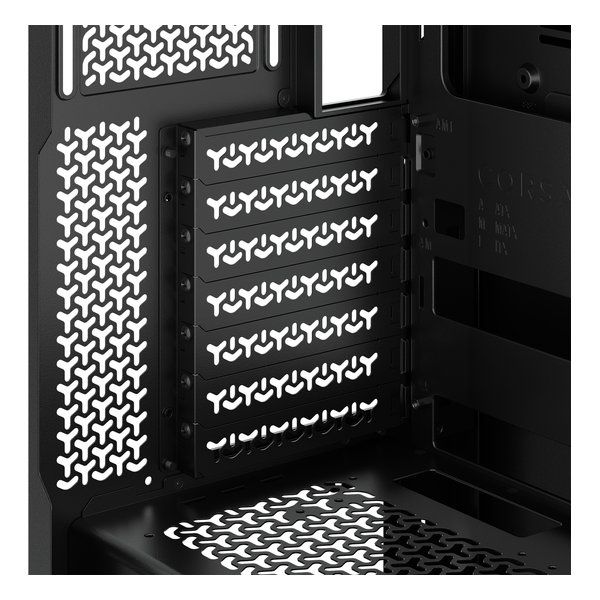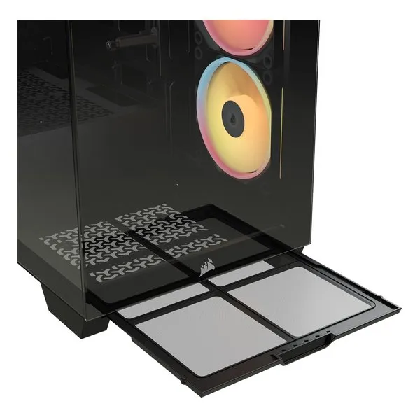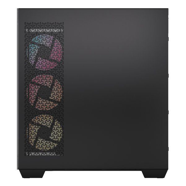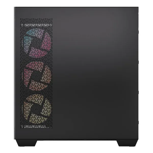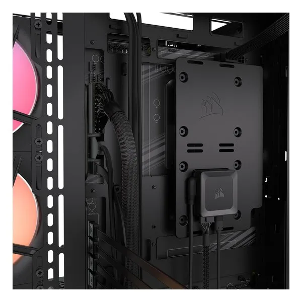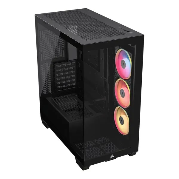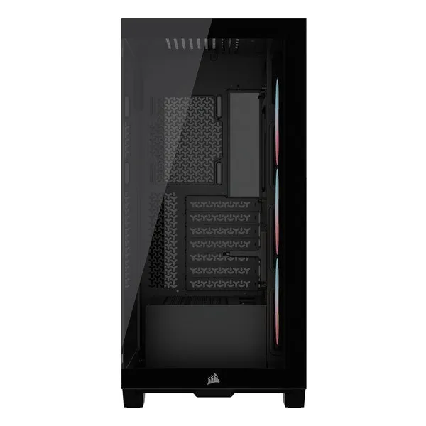 リバースローター設計のiCUE LINKファンを搭載。背面コネクタ設計のマザーボードに対応するピラーレスデザインのミドルタワー型PCケース
