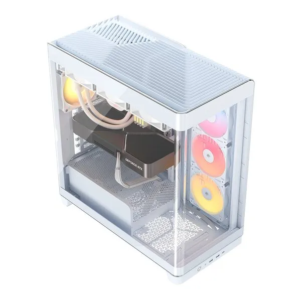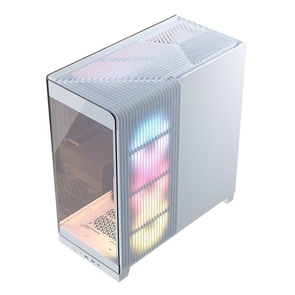 曲面強化ガラスパネルとInfiniRailシステムを採用。リバースローター設計のARGBファンを備えるミドルタワー型PCケース