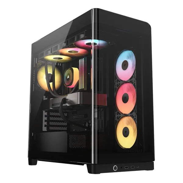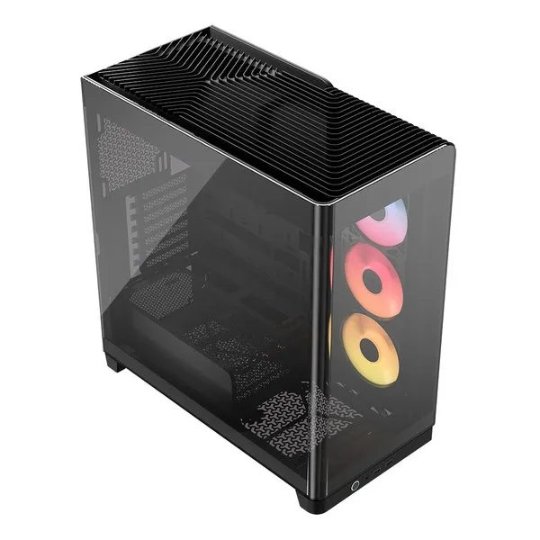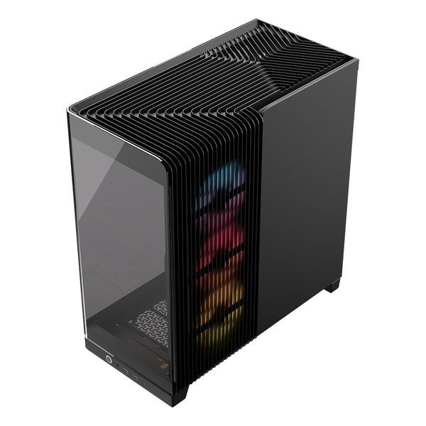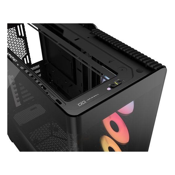 曲面強化ガラスパネルとInfiniRailシステムを採用。リバースローター設計のARGBファンを備えるミドルタワー型PCケース
