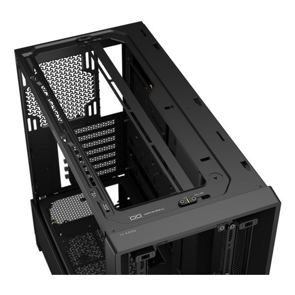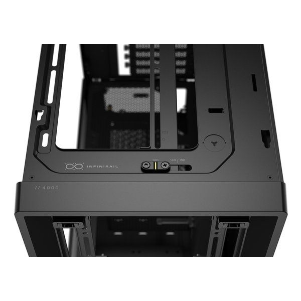 柔軟なファンレイアウトが可能なInfiniRailシステムを搭載。背面コネクタ設計のマザーボードに対応するミドルタワー型PCケース
