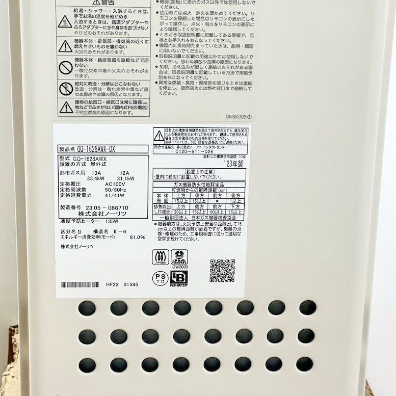 <NORITZ>16号ガスふろ給湯器 都市ガス対応(型番:GQ-1628AWX-DX)【未使用アウトレット品】